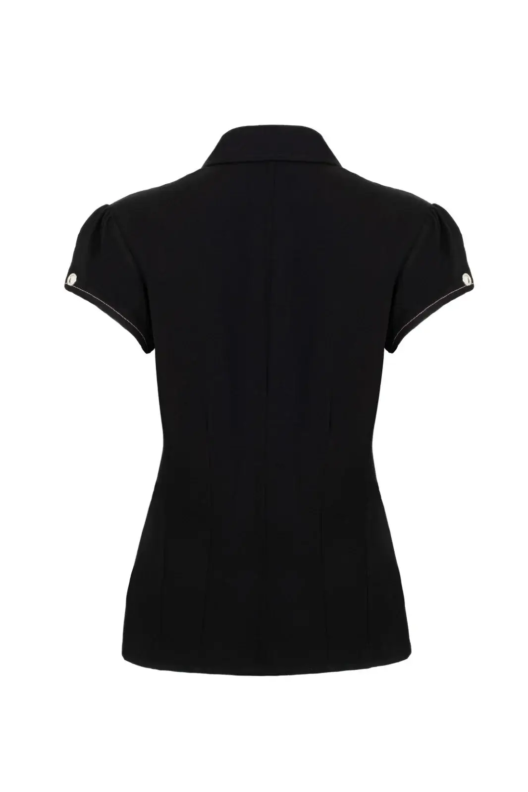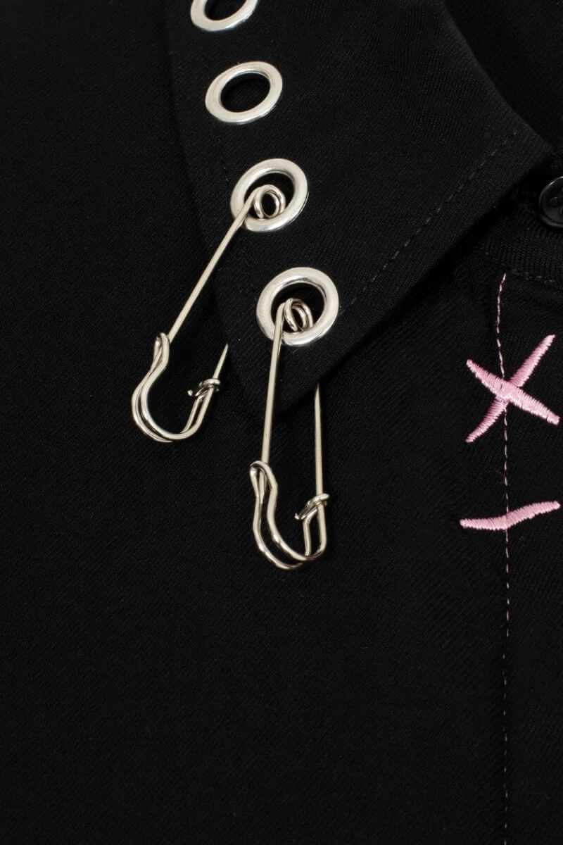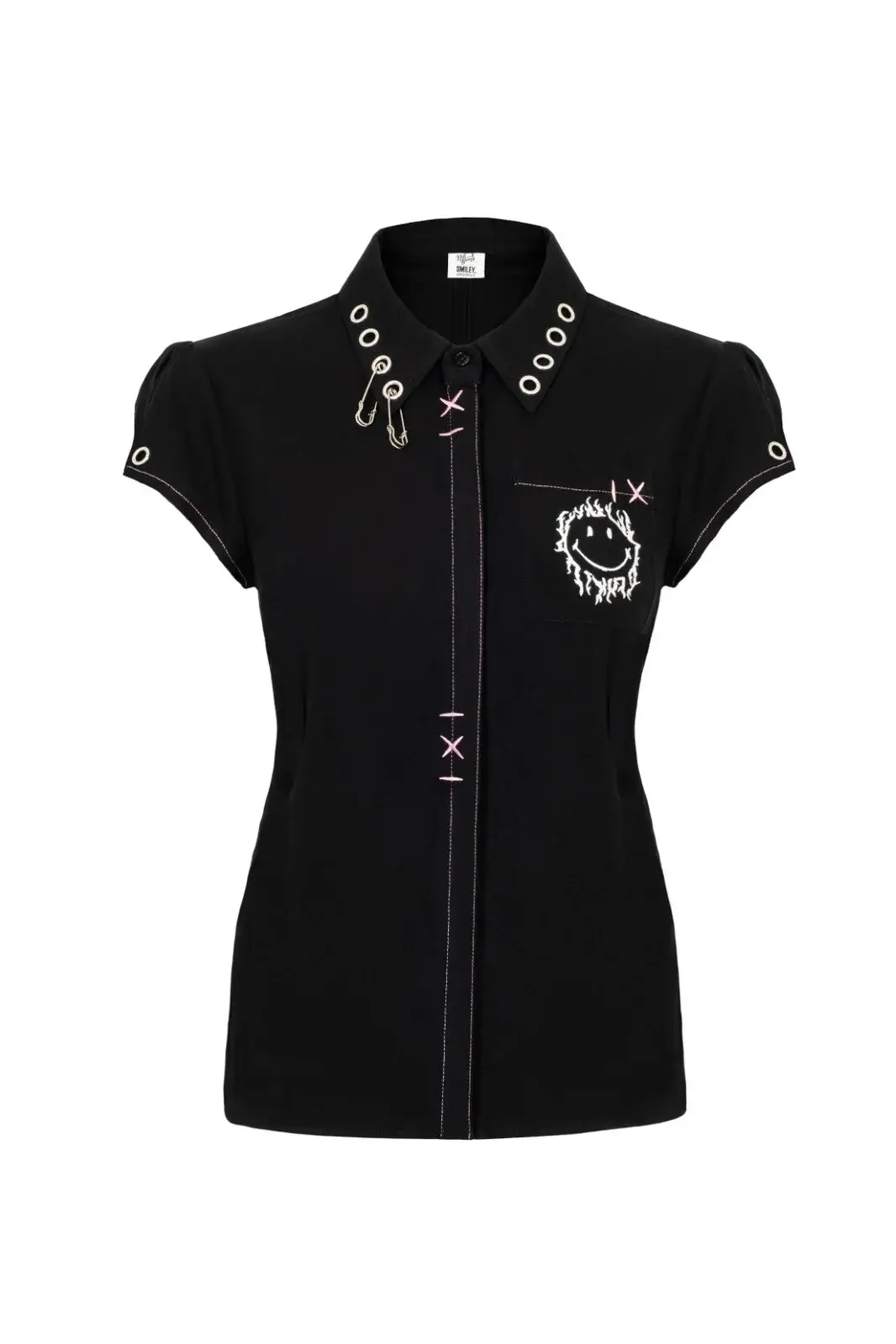 Osa Hell Bunnyn ja Smiley® Originalsin yhteistyötä, Dylan-paita on musta paitis täynnä asennetta. Terävä kaulus saa uuden ilmeen hopeisista rengasniiteistä ja irrotettavista hakaneuloista, jotka tuovat mukaan annoksen kapinaa. Piilotettu nappilista ja rintatasku on viimeistelty pinkeillä tikkauksilla ja Smiley®-kirjonnalla. Halkiohihat ja kontrastiyksityiskohdat viimeistelevät tämän lantiomittaisen viskoosipaidan, joka on kaikkea muuta kuin tavallinen.