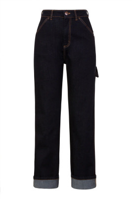 Tummansiniset Carpenter-farkut joustavasta denimistä. Korkea vyötärö, leveät lahkeet, neljä taskua ja koristeellinen vasaralenkki.