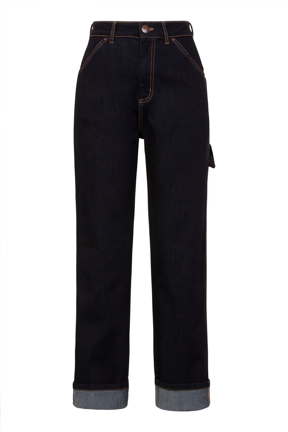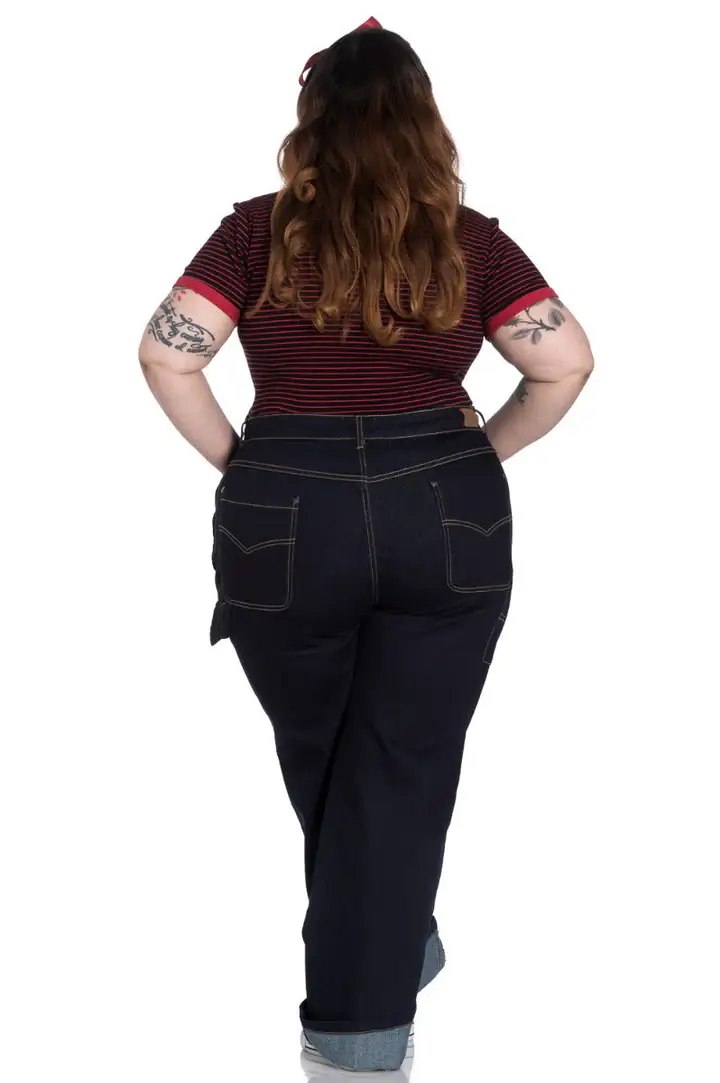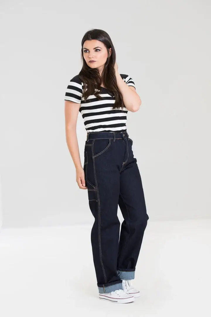 Hell Bunnyn Carpenter-farkut ovat rennon tyylikkäät denimklassikot, joissa yhdistyvät käytännöllisyys ja retrohenkinen asenne. Joustava tummansininen denim istuu mukavasti, ja korkea vyötärö sekä leveät lahkeet luovat modernin mutta ajattoman siluetin.