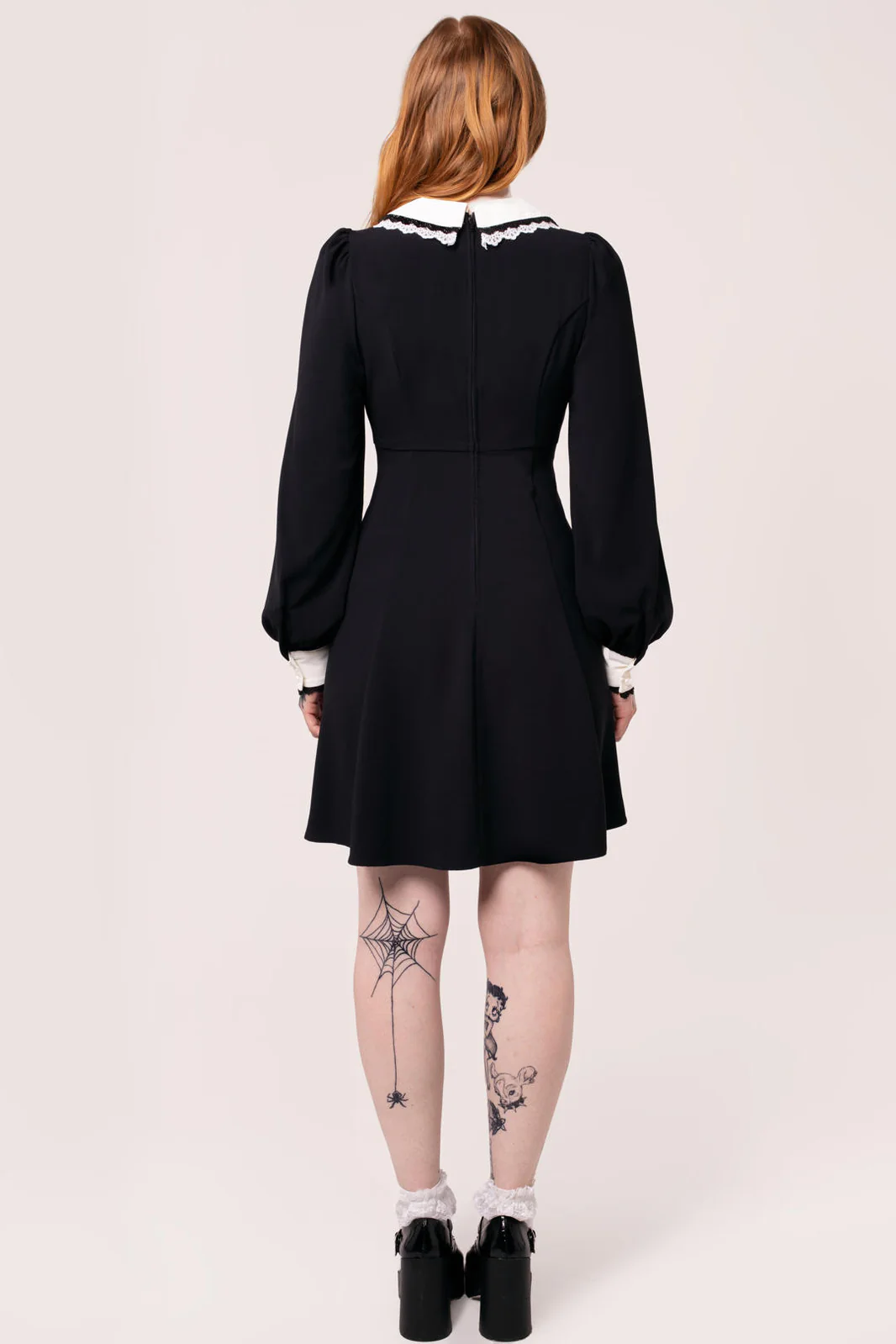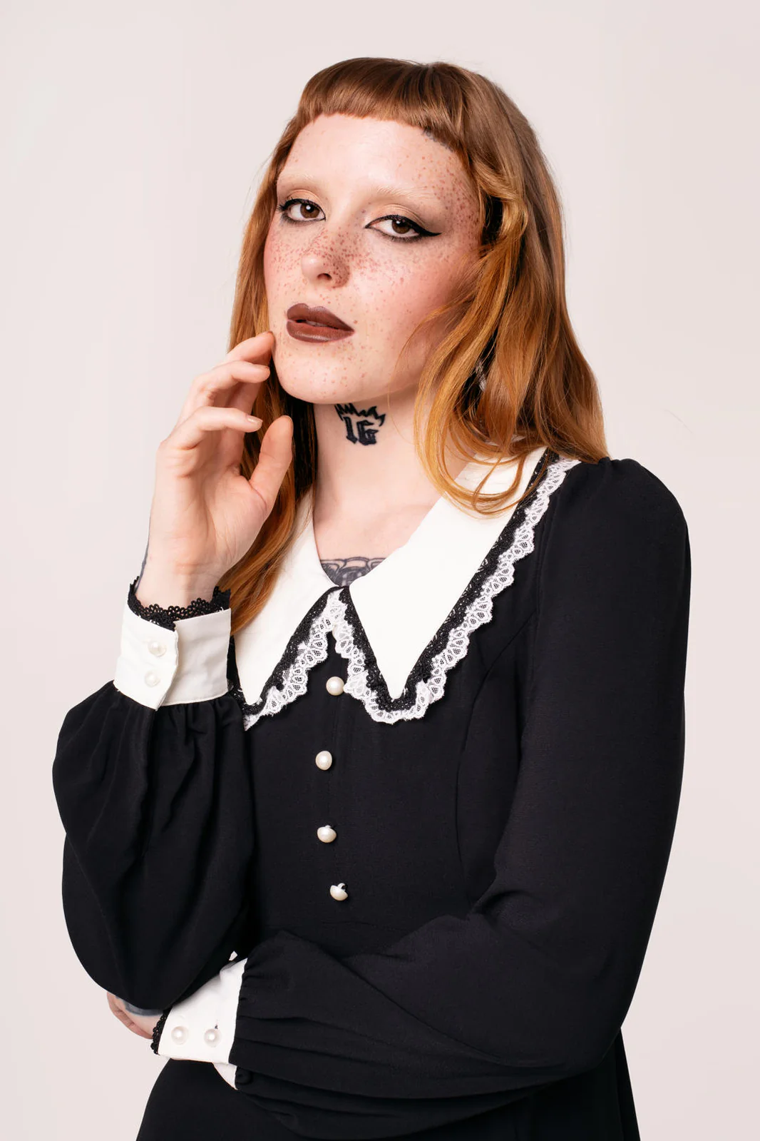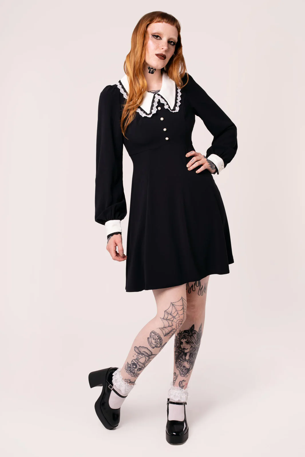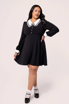 Tämä musta minimekko huokuu synkkää eleganssia ja vintage-vetoa. Mekkoa koristaa ylisuuri terävä kaulus pitsireunuksella sekä valkoiset nappiyksityiskohdat rinnassa, jotka luovat klassisen kontrastin. Täyspitkät puhvihihat ja istuva yläosa korostavat siluettia ennen kuin hame levenee kevyesti vyötäröltä. Täydellinen vaihtoehto niille, jotka etsivät goottisävyistä tyyliä arkeen tai erityisiin hetkiin.