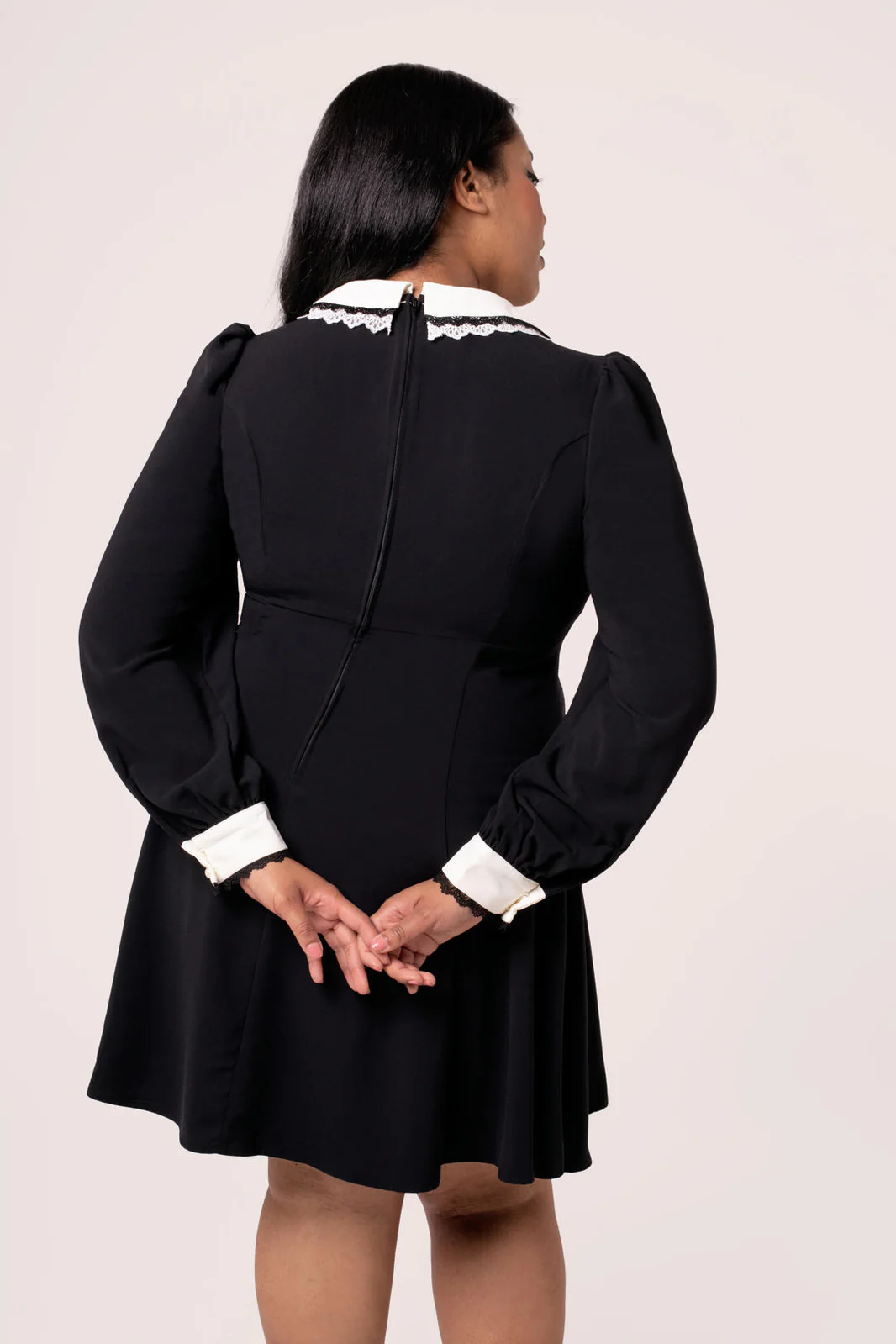 Synkkää eleganssia henkivä musta minimekko, jossa pitsikaulus, puhvihihat ja valkoiset napit –viktoriaanista draamaa Wednesday-hengessä.