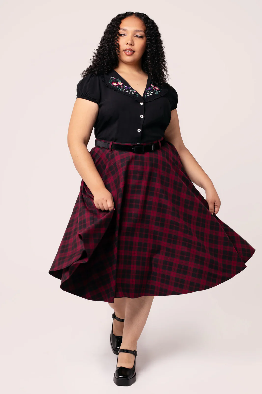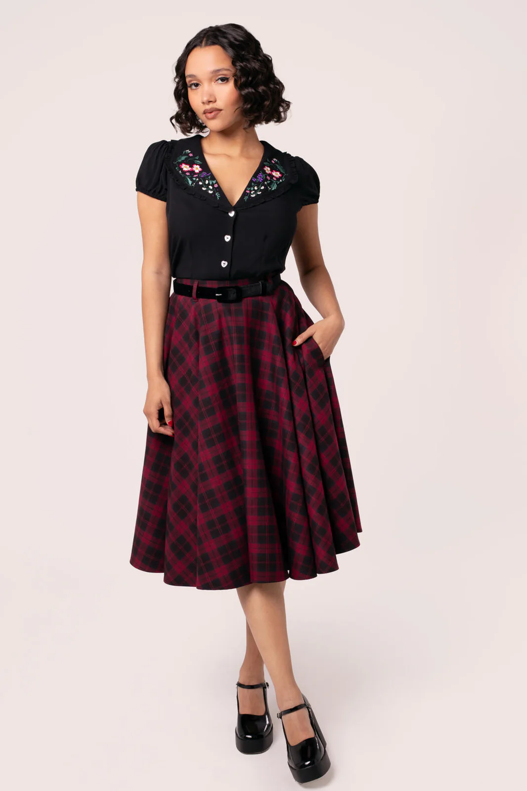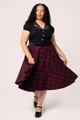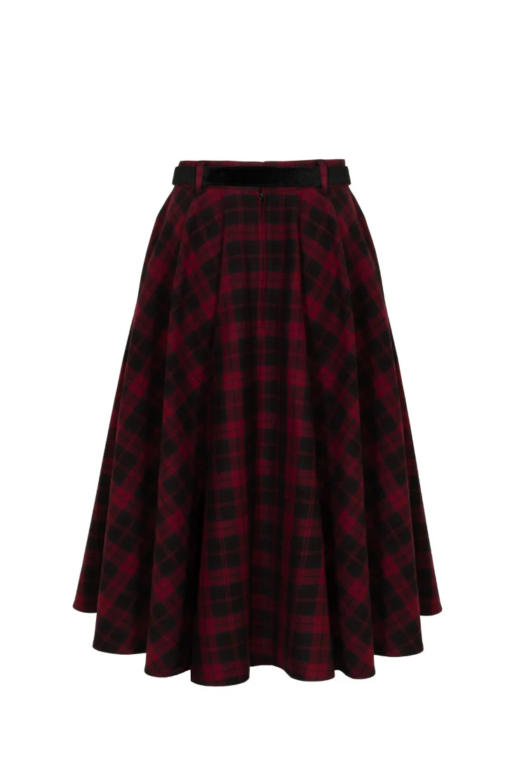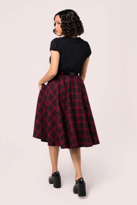 Tämä musta-punainen tartankuosi on klassikko, joka kestää aikaa. Carmina-hameen kellohelma laskeutuu vyötäröltä kauniisti ja luo runsaasti volyymia. Huomaamattomat sivutaskut tuovat käytännöllisyyttä, ja mukana tuleva musta samettivyö viimeistelee vintage-henkisen ilmeen. Yhdistä alushameeseen saadaksesi näyttävän, dramaattisen tyylin.