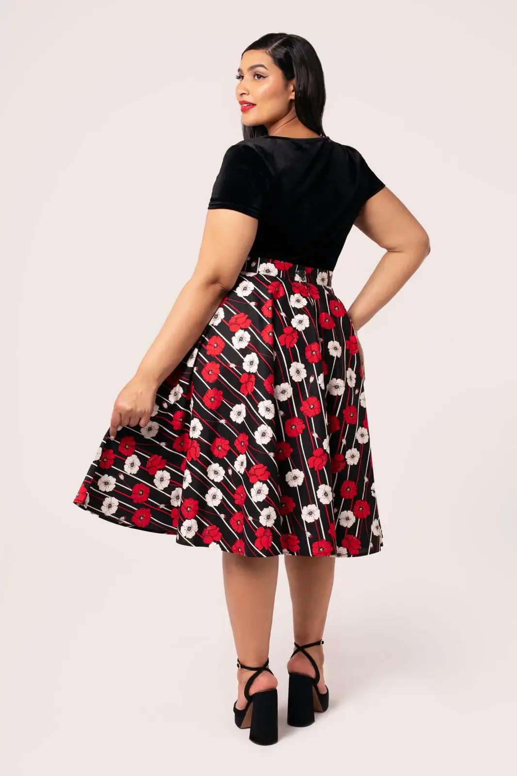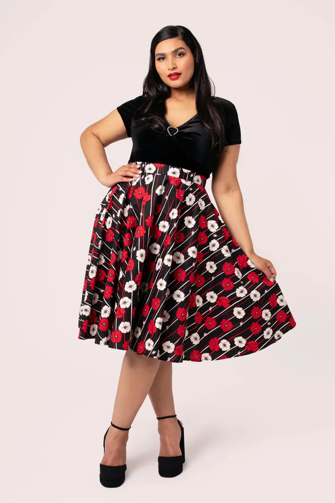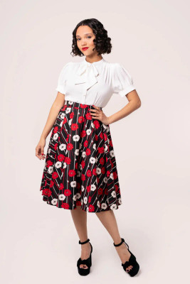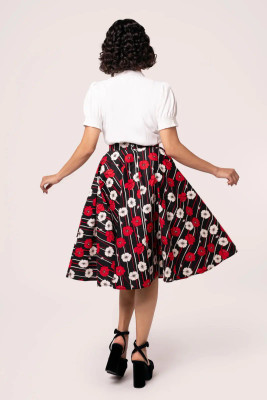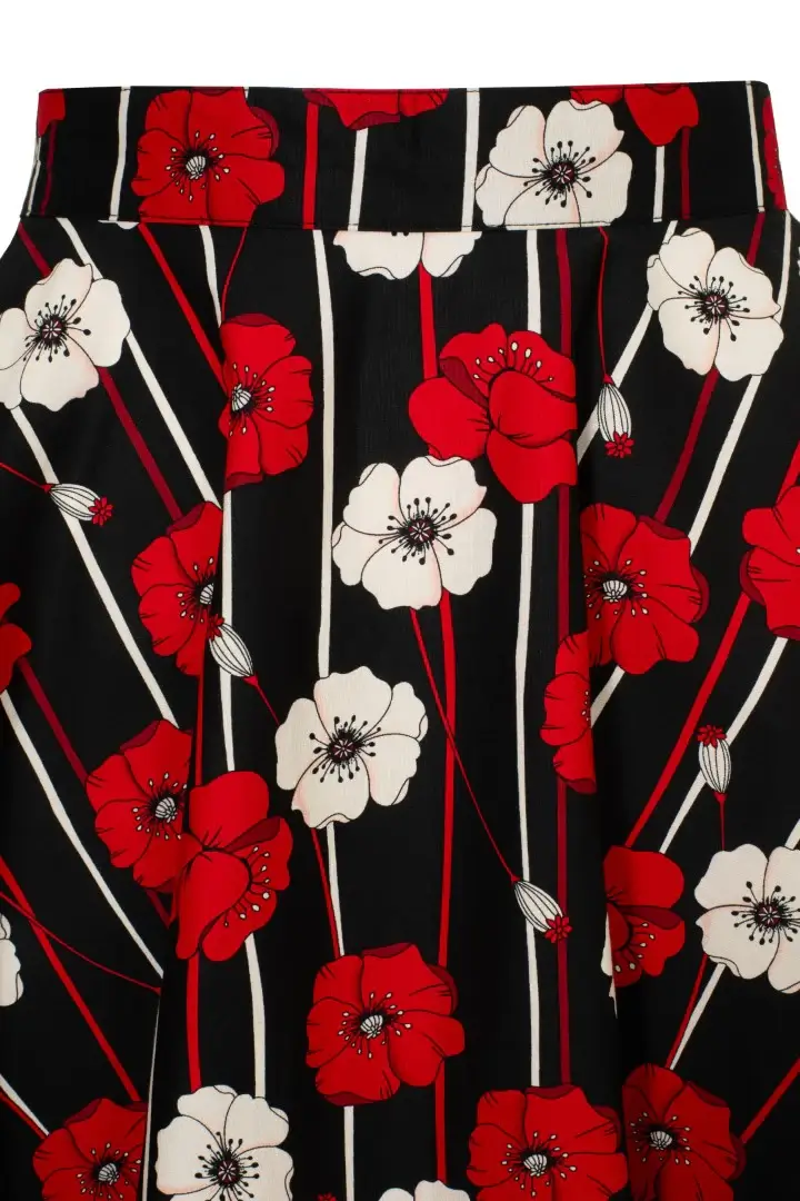 Hell Bunny Poppy on 50-luvun henkinen kellohelmainen hame, jossa mustalla pohjalla suuret unikkokuviot ja punavalkoiset raidat. Käytännölliset sivutaskut.