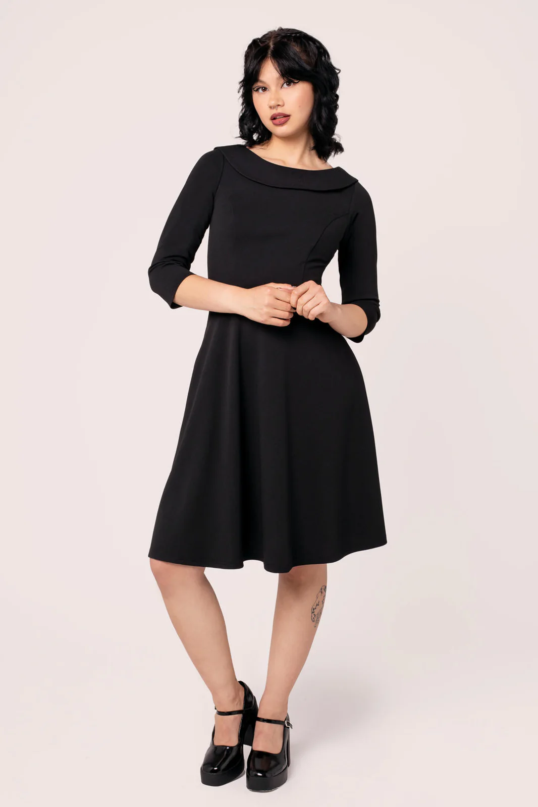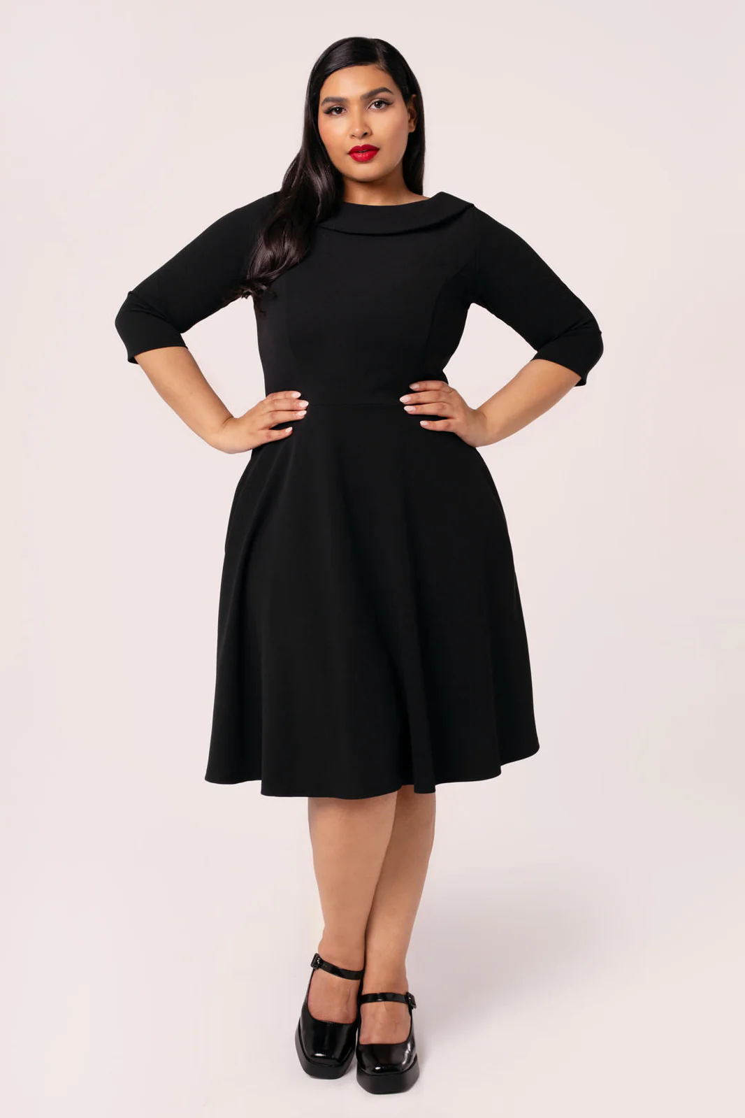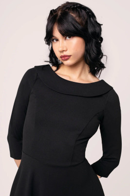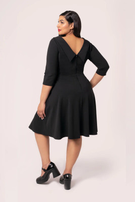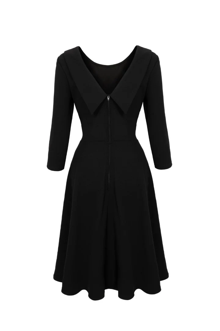 Hell Bunny Lois - elegantti, musta mekko, jossa on 3/4 hihat,korkea uurrettu yläosa, runsas levenevä hame ja käytännölliset piilotaskut sivusaumoissa.