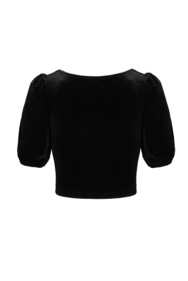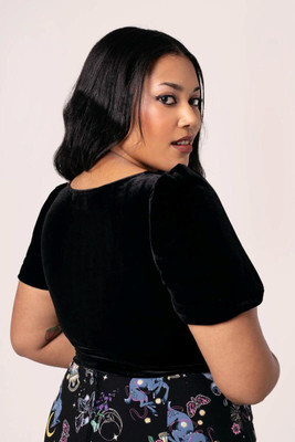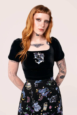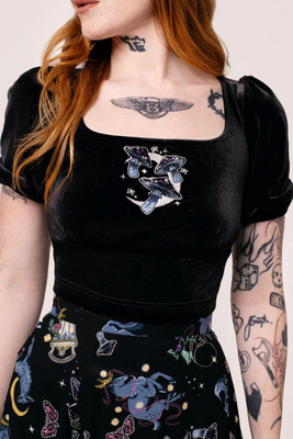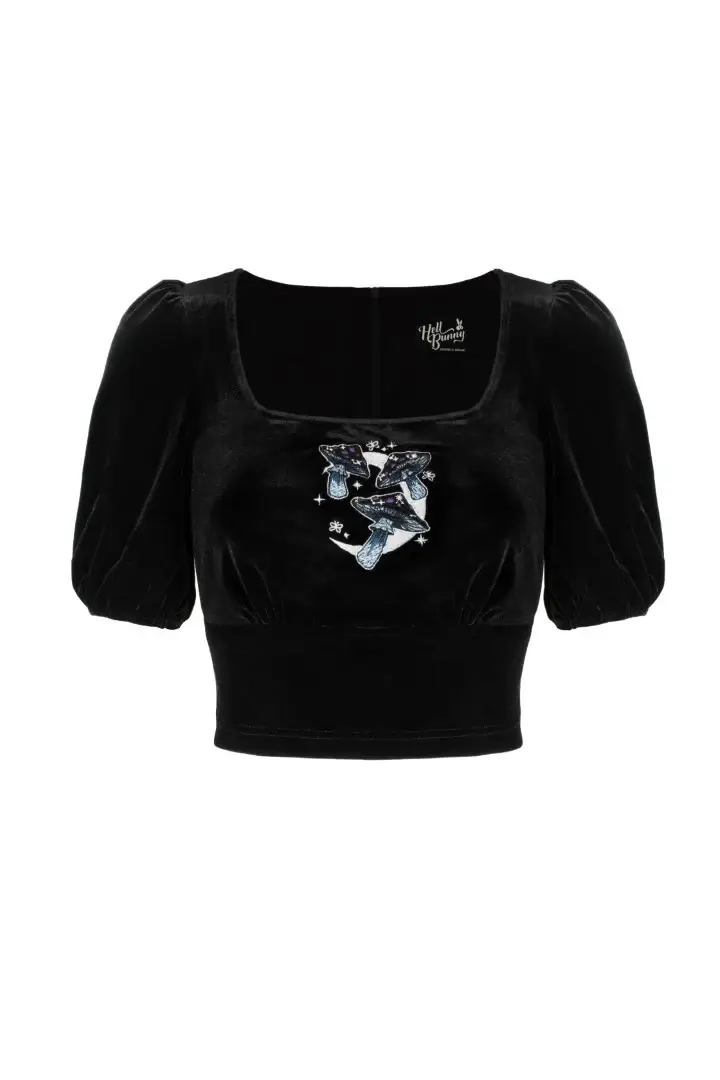 Hell Bunnyn Moonlit - lyhyt musta samettitoppi, jota koristavat sienet, kuut ja tähdet. Se sopii täydellisesti yhteen Moonlit Midi -hameen kanssa.