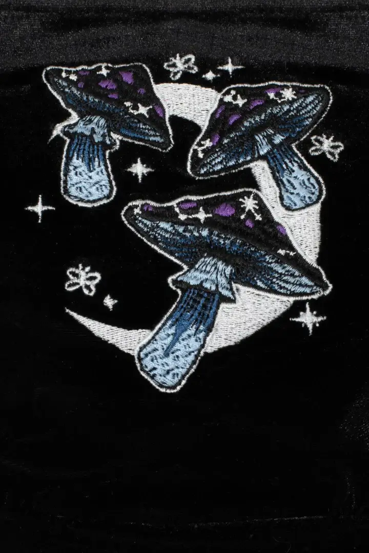 Hell Bunny Moonlit -toppi kutsuu sinut häikäisevään kuutamoyöhön. Pehmeä, musta sametti toimii taustana monimutkaiselle kirjonnalle, jossa suloiset sienet, loistavat kuut ja tuikkivat tähdet kietoutuvat yhteen luoden mystisen ja satumaisen tunnelman.