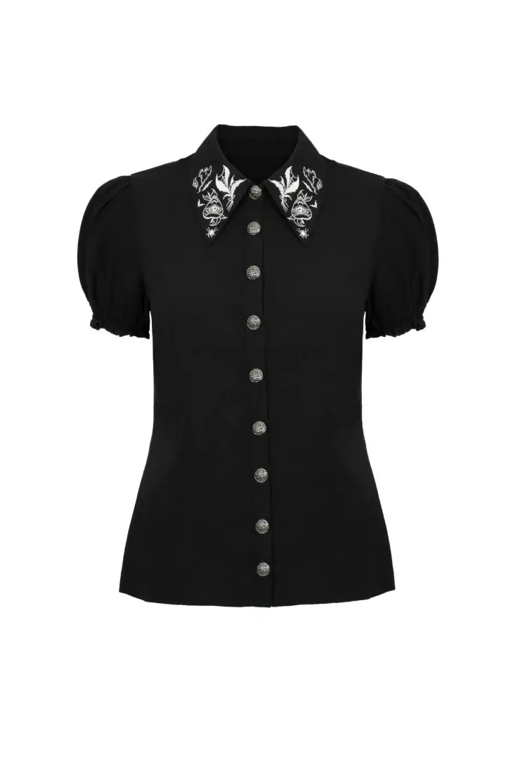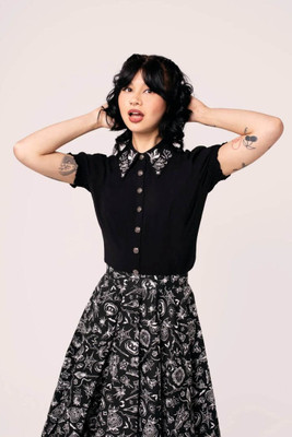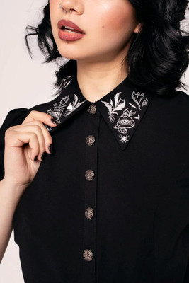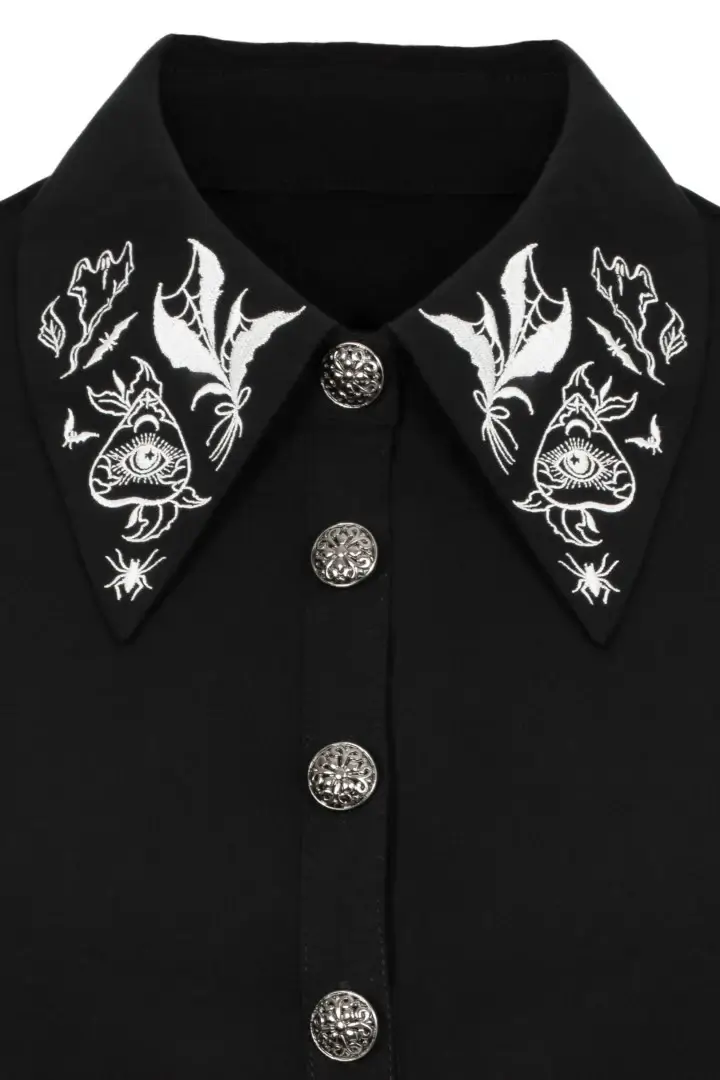 Hell Bunny Mischief - lyhythihainen, goottilaistyylinen pusero terävällä kauluksella ja noita-aiheisella kuviolla. Edessä nappikiinnitys.