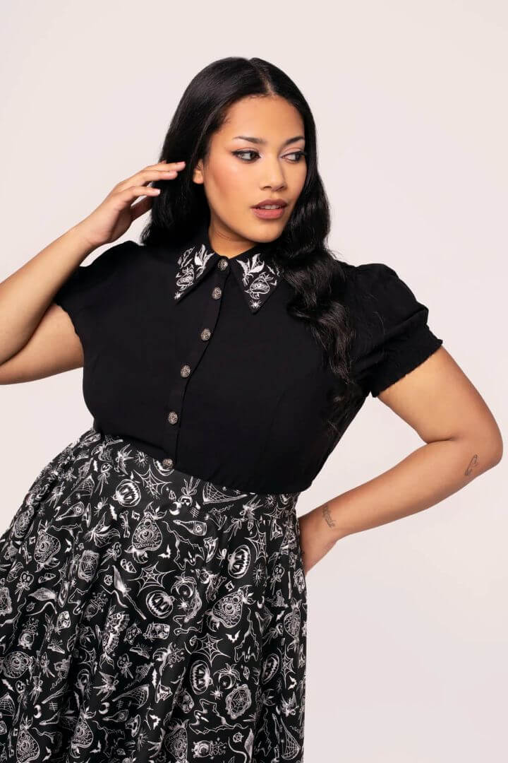Hell Bunny Mischief -viskoosipusero yhdistää goottilaisen estetiikan ja arjen helppokäyttöisyyden. Musta pohja ja teräväkärkinen kaulus, jota koristaa noita-aiheinen kuviointi, luovat heti erottuvan ja teatraalisen ilmeen. Lyhyet puhvihihat joustavilla hihansuilla tuovat romanttista muotoa ja tekevät puserosta mukavan käyttää.