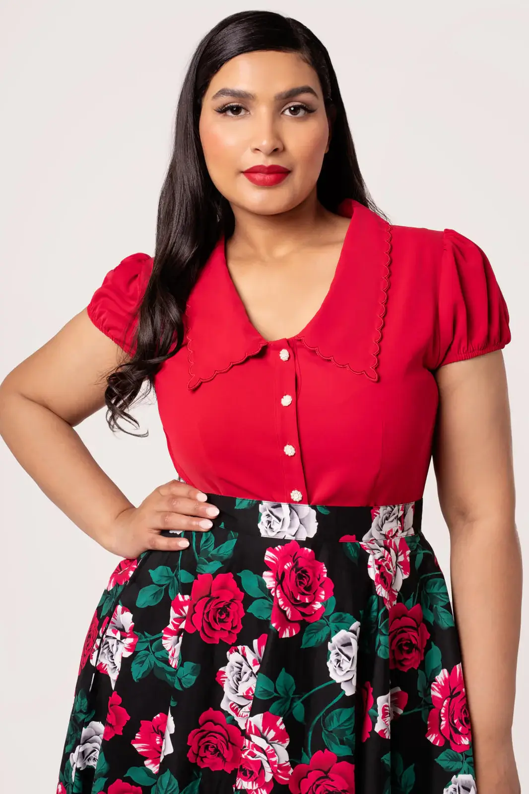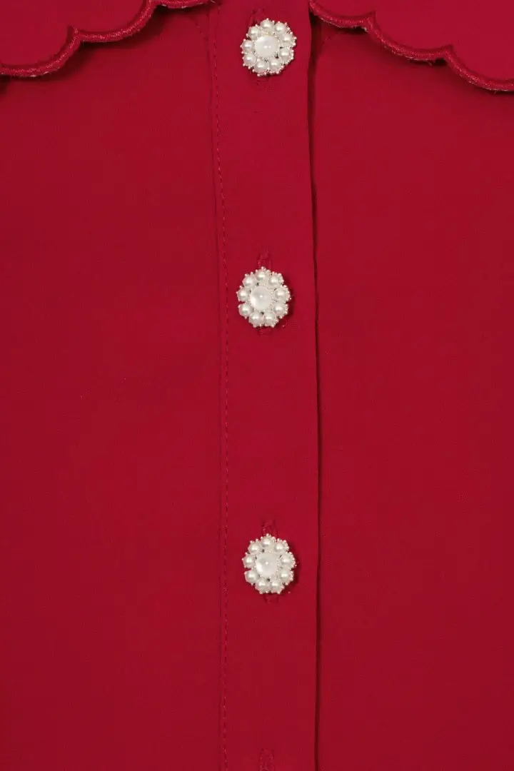 Viehättävä 40-luvun tyylinen Maddy-pusero huulipunanpunaisessa sävyssä. Simpukkareunainen kaulus, puhvihihat ja norsunluunapit tuovat glamouria olemukseesi.
