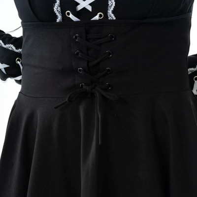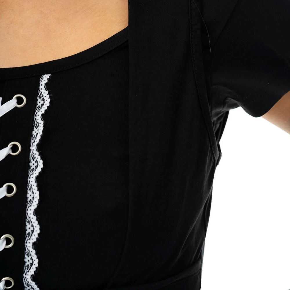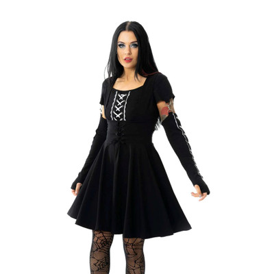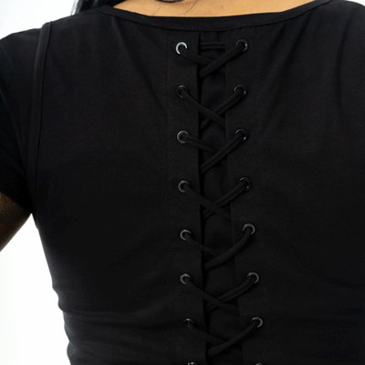 Musta Ondine-trikoomekko korsettinyörityksin. Tyköistuva yläosa, levenevä hame ja rohkea leikkaus tuovat kapinallisen asenteen tyyliisi.