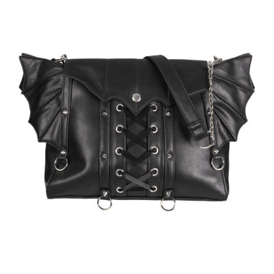 Mustassa olkalaukussa on lepakkosiivet, koristenyöritys ja niittiyksityiskohtia. Ketjuhihna ja vetoketjutaskut tekevät laukusta näyttävän ja käytännöllisen.
