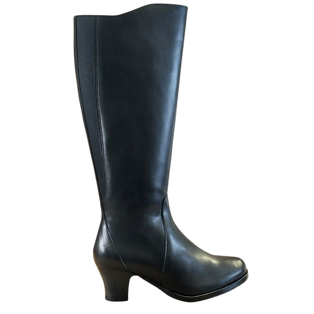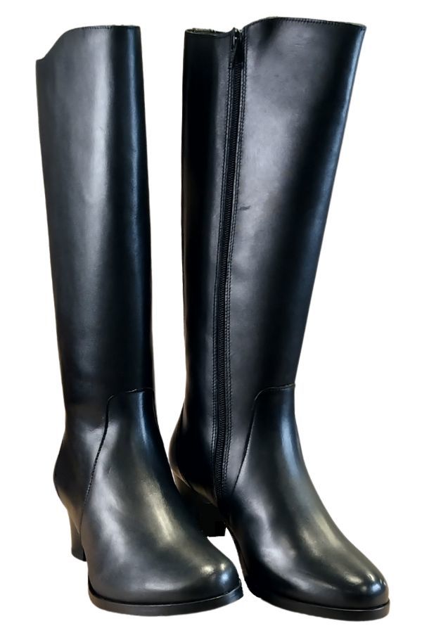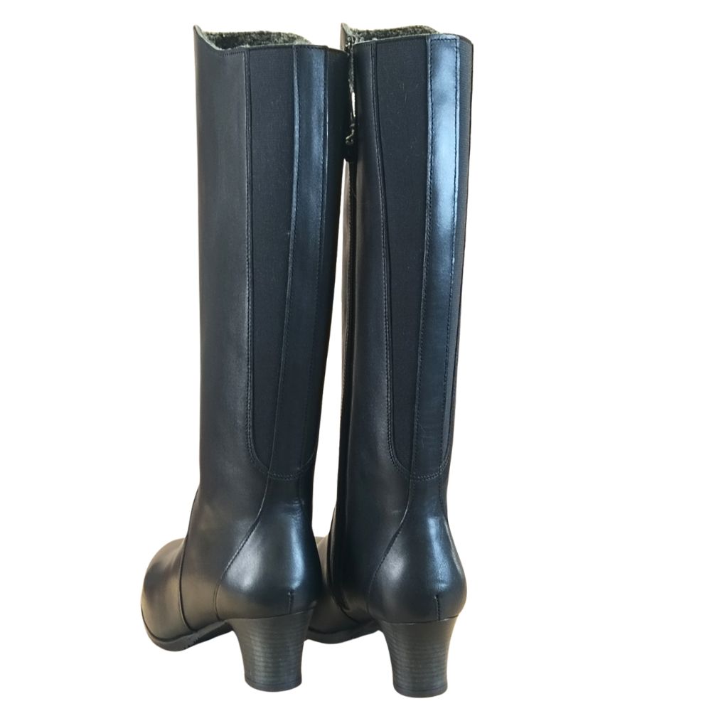 Pitkävartinen musta nahkasaapas, jossa 5,5 cm korko ja pohjevenykkeet takasaumassa. Tekstiilihuopavuori ja vetoketju sisäsivulla.