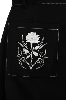 Hameen katseenvangitsijana toimii suuri etutasku, jossa on valkoiset tehostetikkaukset ja ruusuaiheinen kuvio. Vyötäröllä oleva hopeinen sydänriipus tuo kokonaisuuteen tunnistettavaa Hell Bunny -asennetta. Vyölenkit mahdollistavat stailauksen omalla vyöllä, ja siisti nappi- ja vetoketjukiinnitys takana varmistaa hyvän istuvuuden.