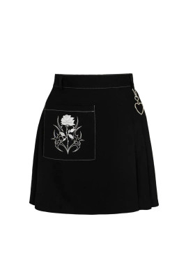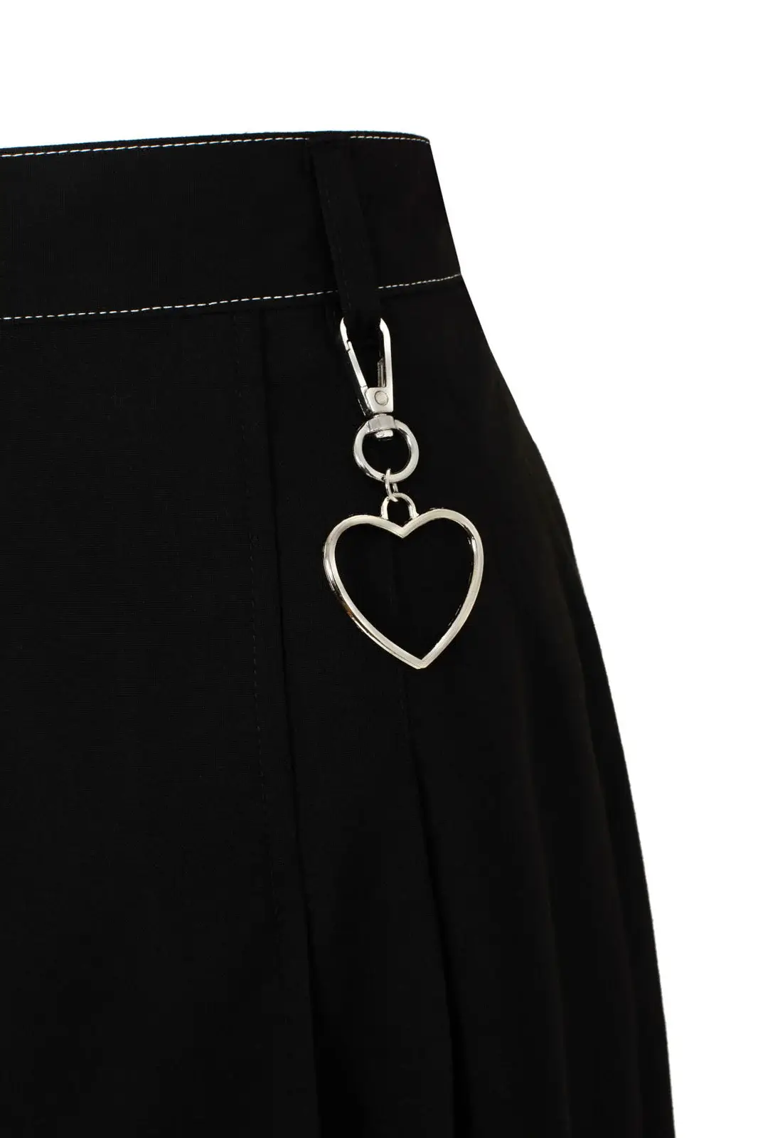 Musta laskostettu minihame näyttävällä taskulla, valkoisilla tehostetikkauksilla ja hopeisella sydänkoristeella. Asennetta arkeen ja iltaan.