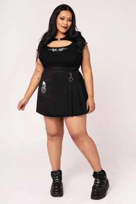HELL BUNNY AURI -minihame yhdistää klassisen laskostetun siluetin ja vaihtoehtoisen tyylin yksityiskohdat. Musta, ryhdikäs kangas laskeutuu kauniisti ja luo hameeseen liikkeen tuntua, joka toimii niin arjessa kuin iltamenoissakin.