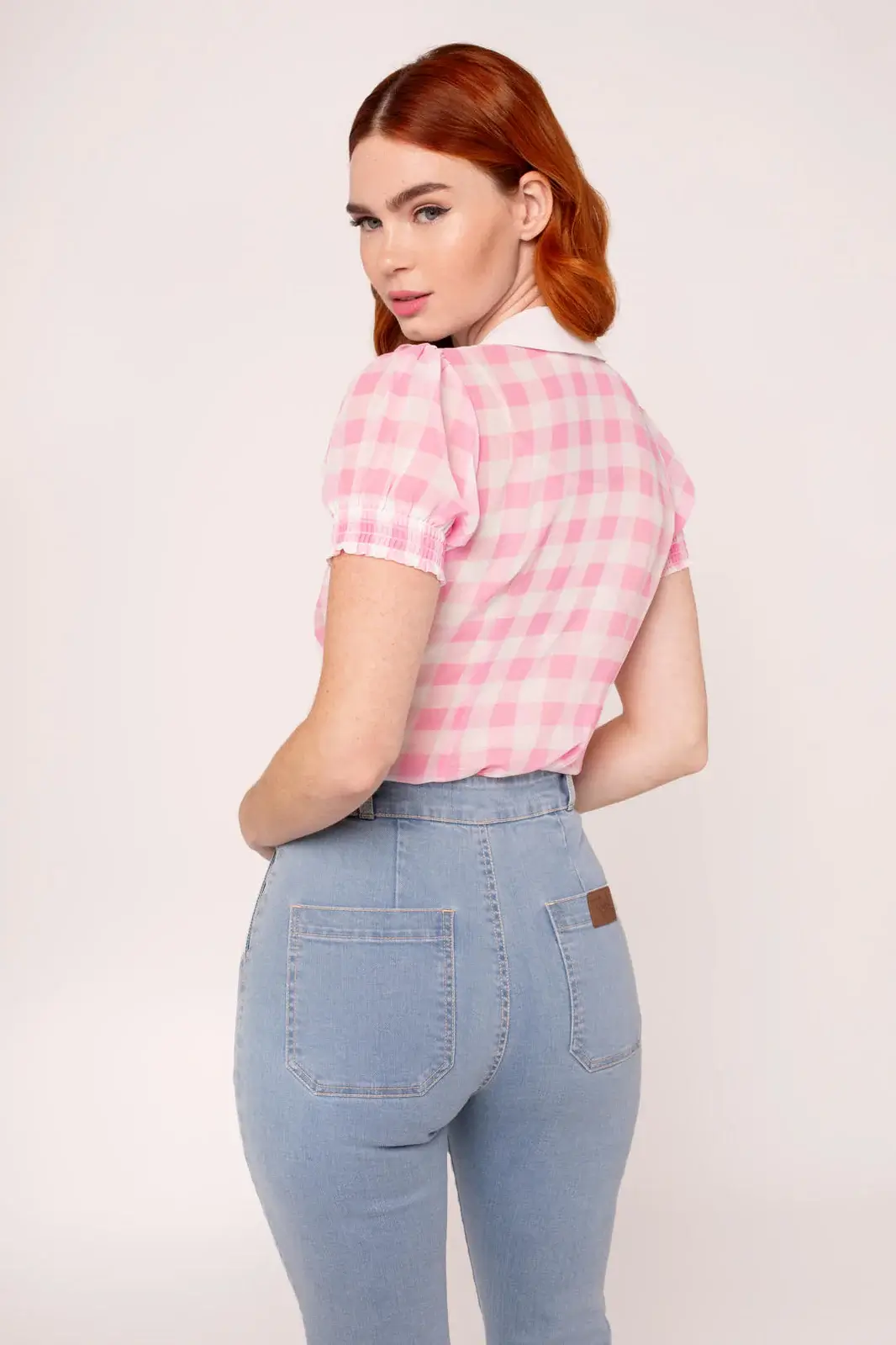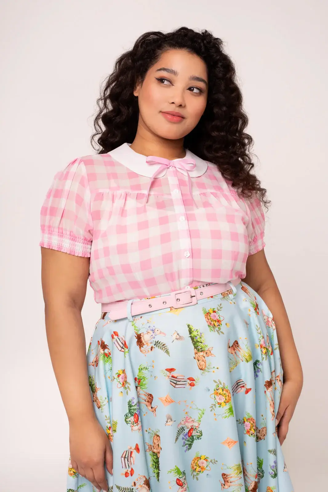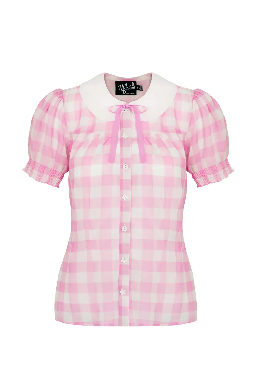 Hell Bunny Cindy -sifonkipusero on pinkki-valkoinen ruutupusero, jossa kaareva valkoinen kaulus, puhvihihat ja kevyt sifonki luovat pehmeän retrohenkisen ilmeen