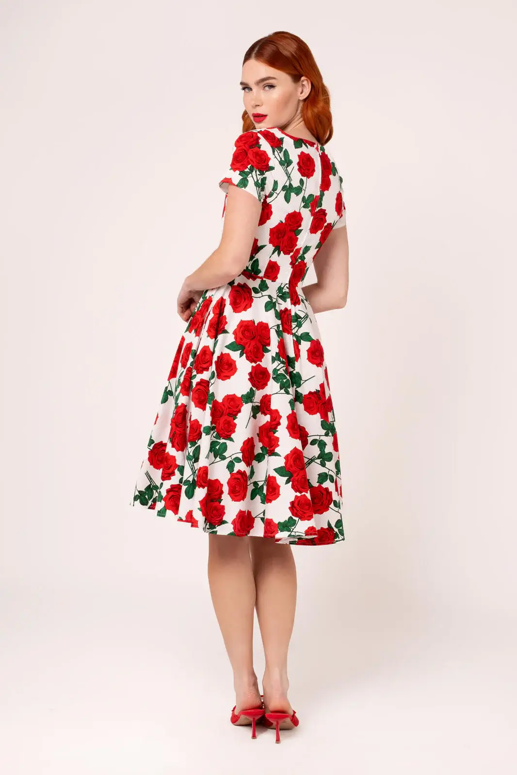 Käännä katseita tässä upeassa 50-luvun inspiroimassa mekossa, jossa yhdistyvät valkoinen pohja ja suuret punaiset ruusut vastustamattomaksi kokonaisuudeksi.