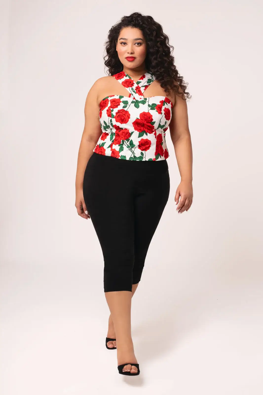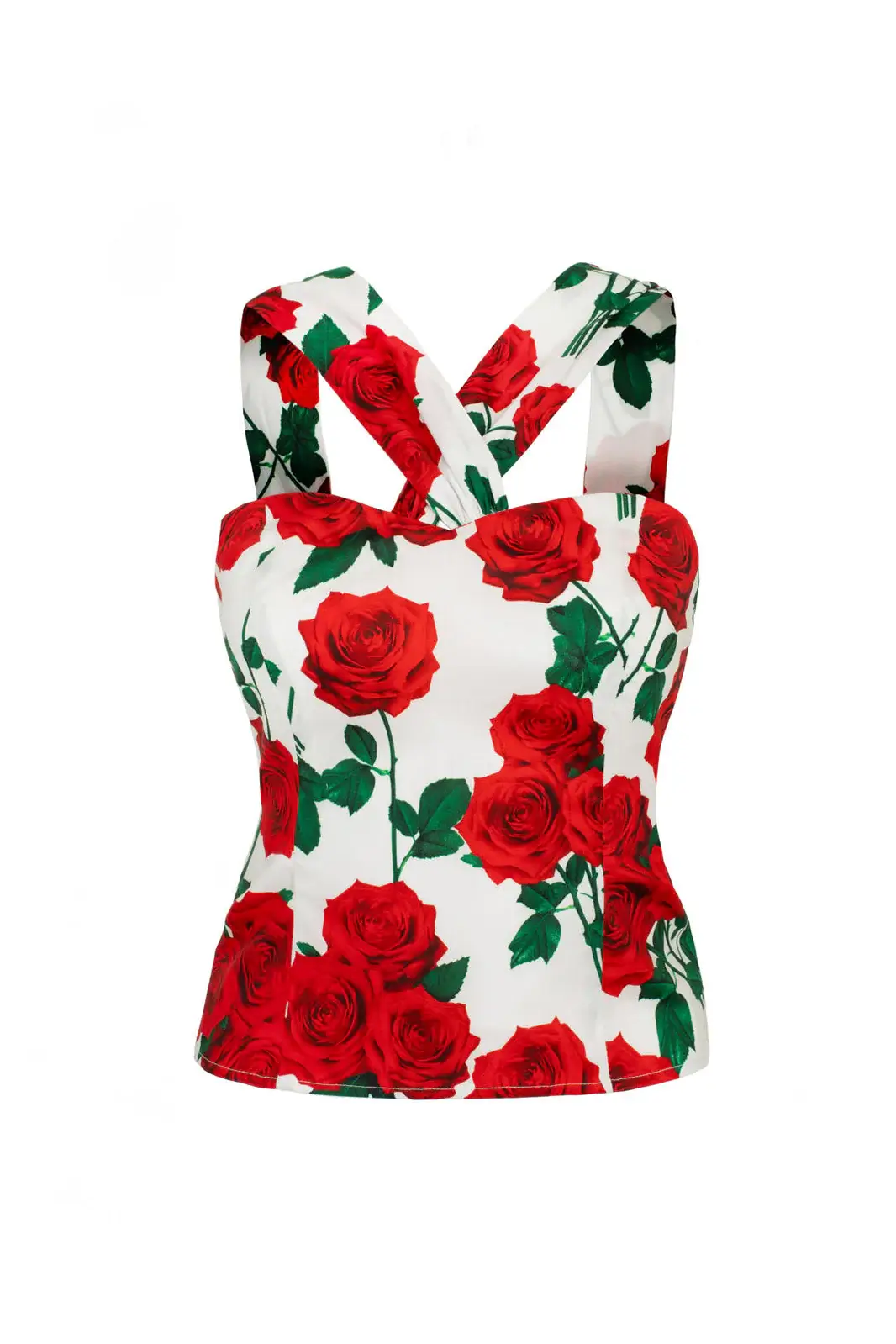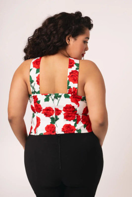 Muotoiltu leikkaus ja prinsessasaumat korostavat vartaloa imartelevasti, tehden topista sekä tyylikkään että mukavan käyttää. Mustalla pohjalla hehkuvat punaiset ruusut tuovat ripauksen menneiden aikojen glamouria, ja laadukas puuvillasekoite (98 % puuvillaa, 2 % elastaania) tuntuu miellyttävältä ihoa vasten.