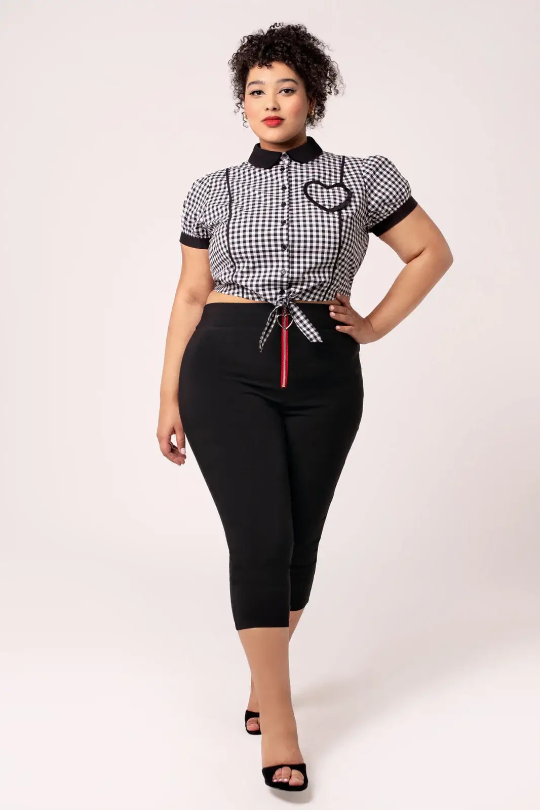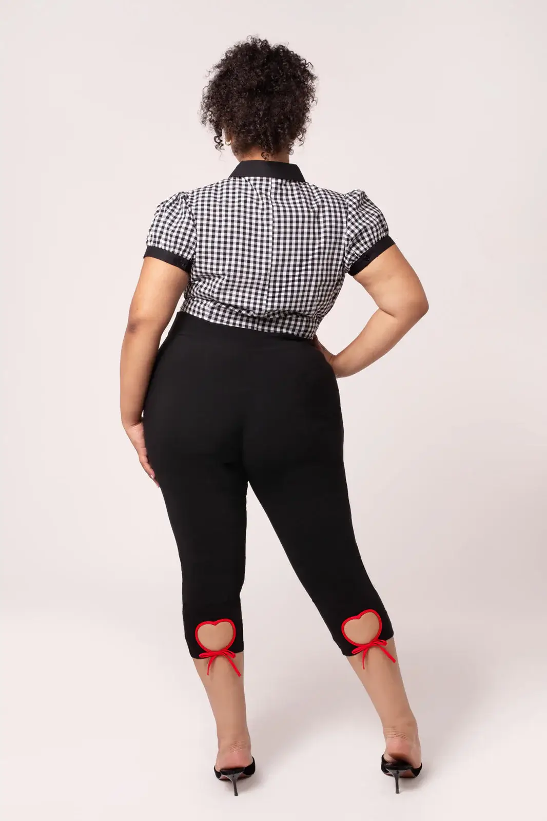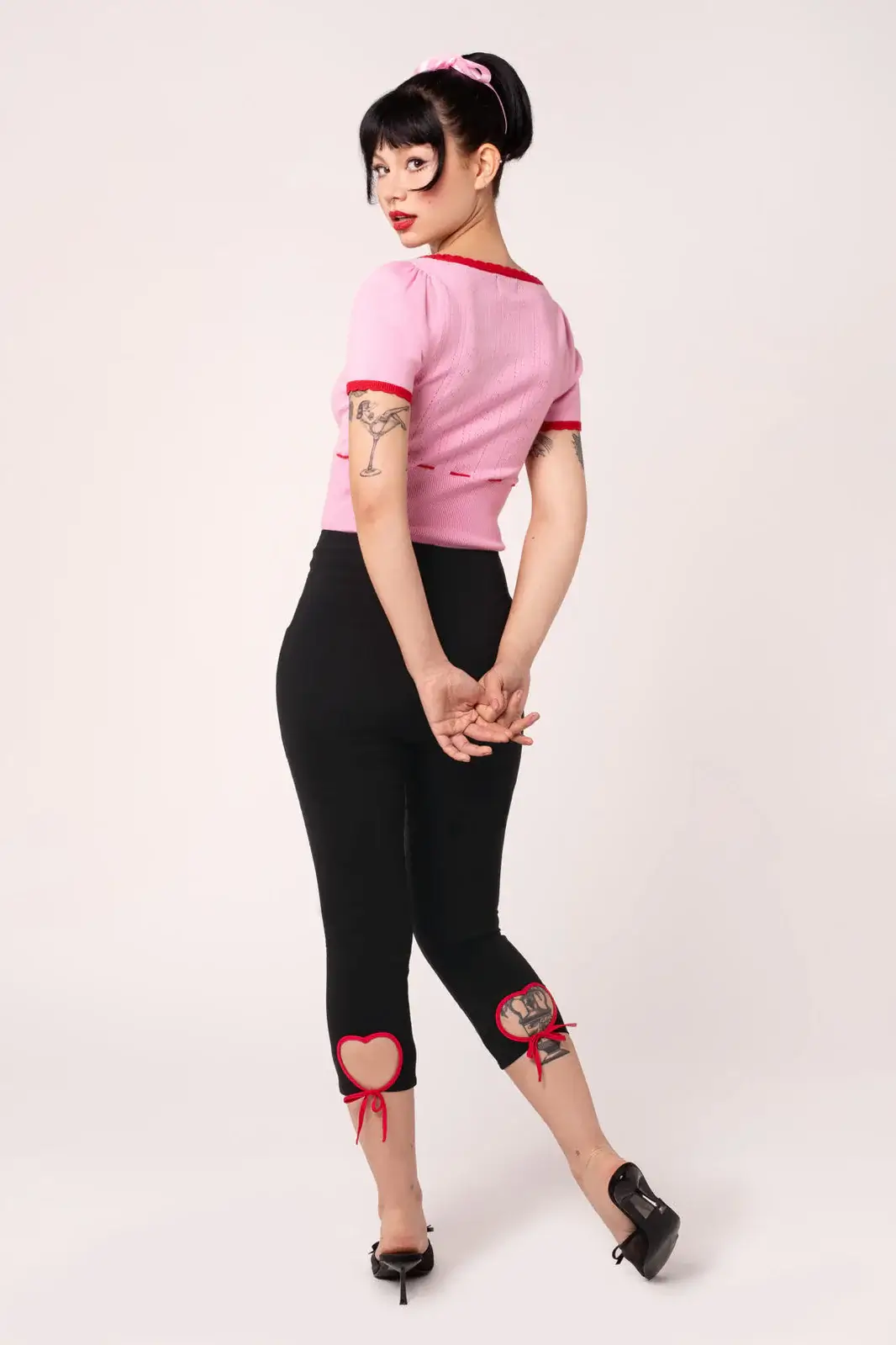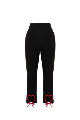 Lahkeiden takaosassa olevat sydänleikkaukset punaisilla reunuksilla ja rusettiyksityiskohdilla tuovat housuihin ripauksen 50-luvun inspiroimaa pin-up-henkeä. Klassinen capri-pituus tekee mallista monikäyttöisen – täydellinen yhteen sovitettuna puseroiden, neuleiden tai lyhyiden jakkujen kanssa.