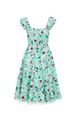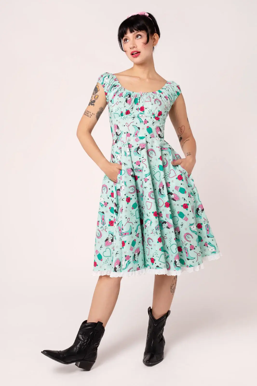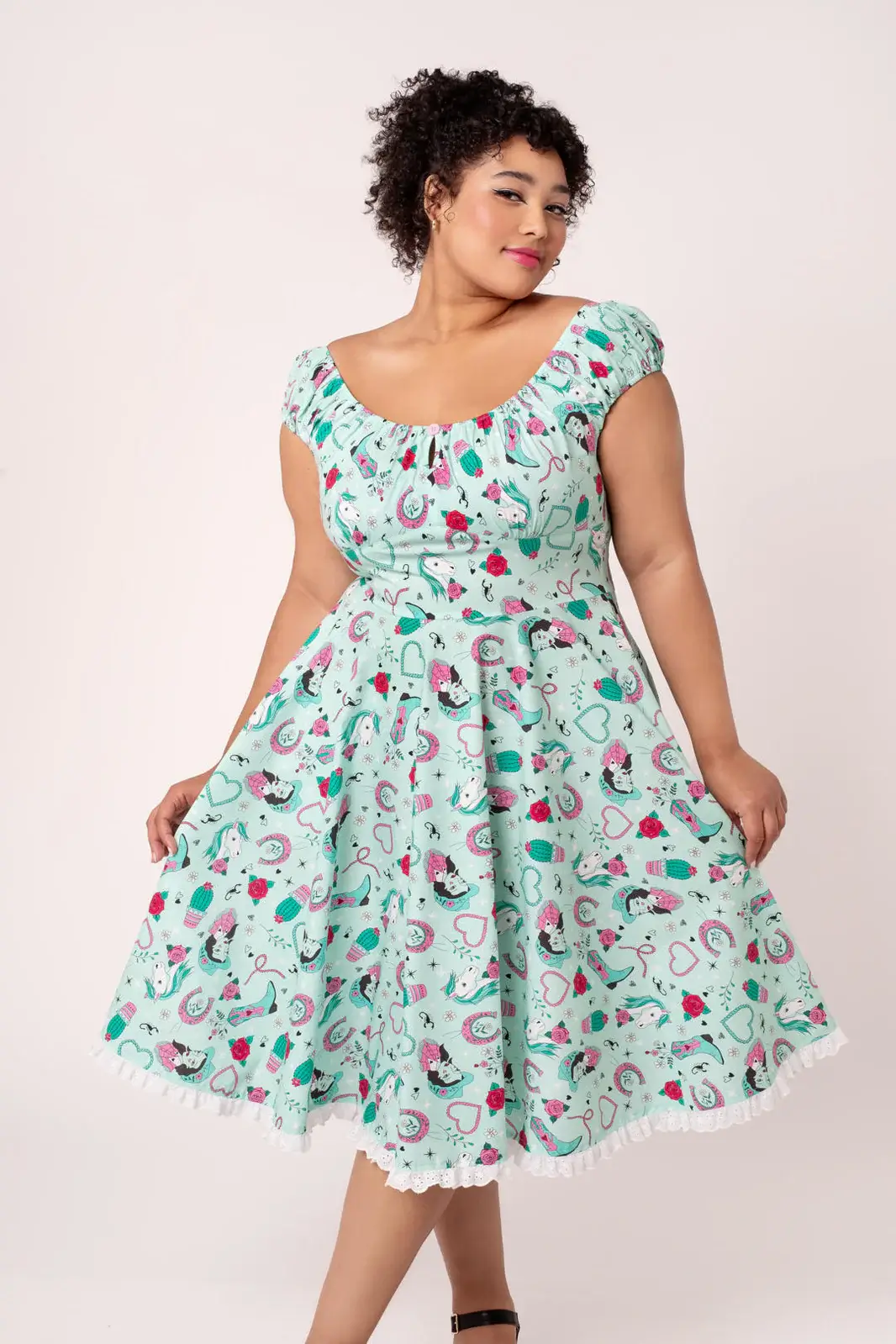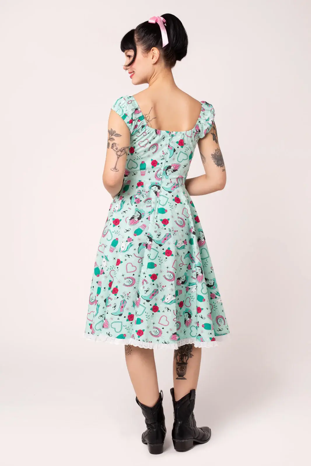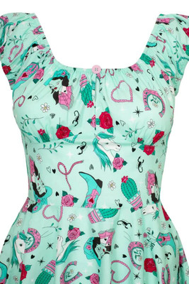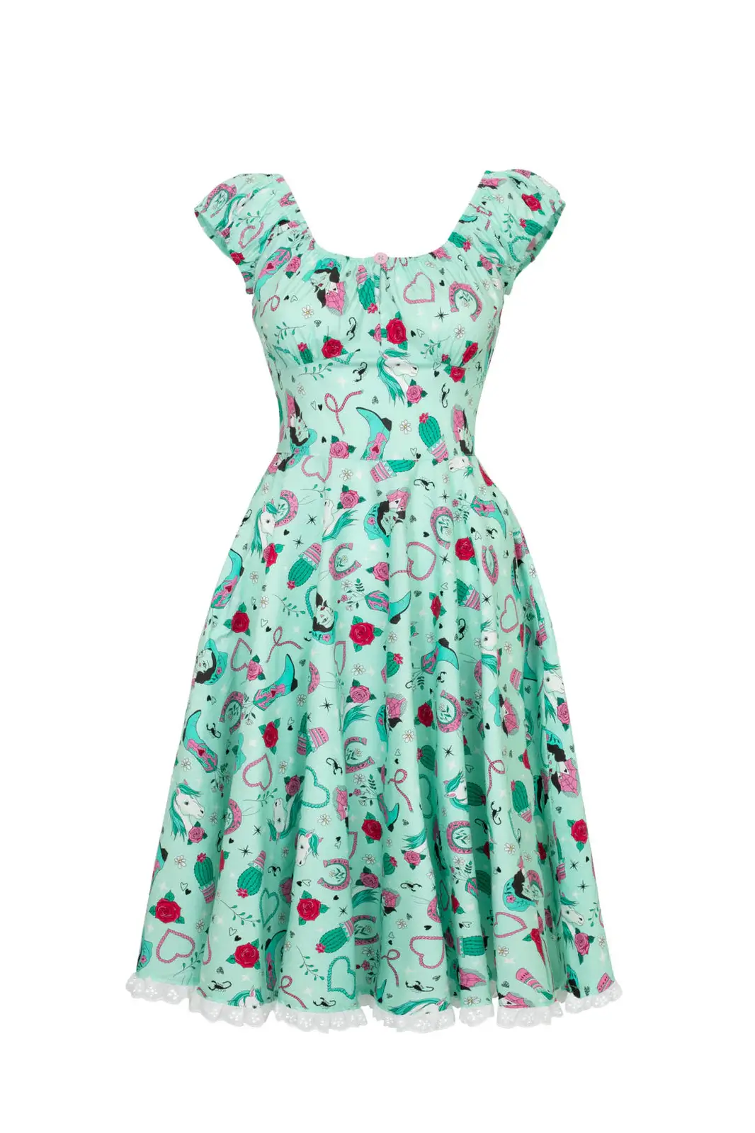 Hell Bunny Kellie on mekko, jossa vintage-romantiikka kohtaa pilkkeen silmäkulmassa. Mintunvihreää puuvillapohjaa elävöittävät hevoset, cowboy-saappaat ja kaktukset – kuosi, joka herättää huomion mutta pysyy tyylikkäänä.