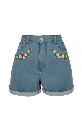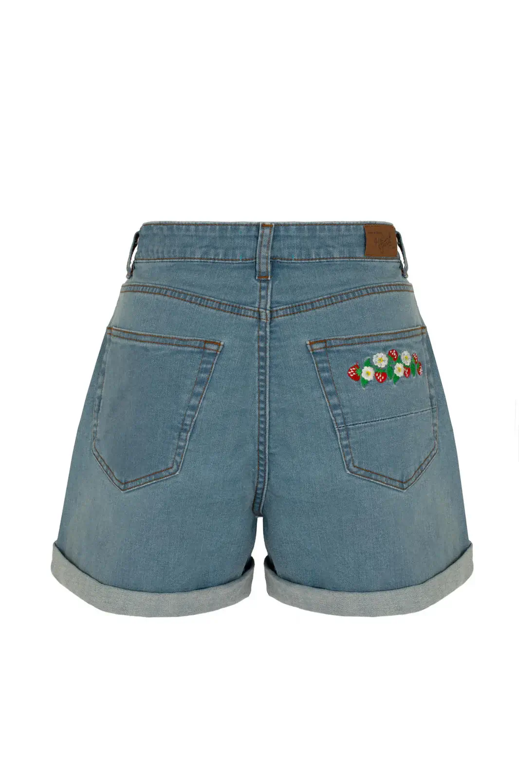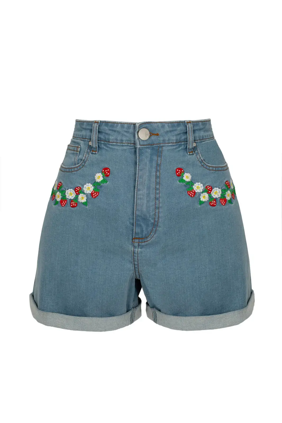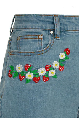 Joustavat Francoise-denimshortsit hurmaavat mansikka- ja päivänkakkarakirjailulla. Käännetyt lahkeet ja klassinen malli tekevät niistä kesän luottovaatteen.