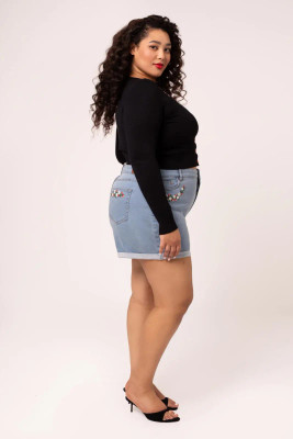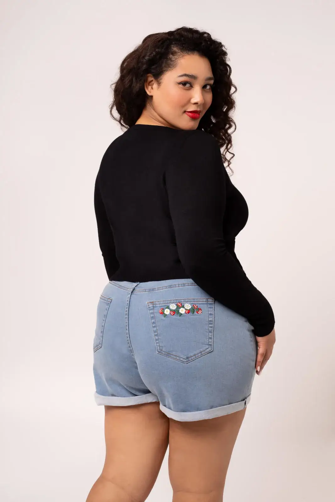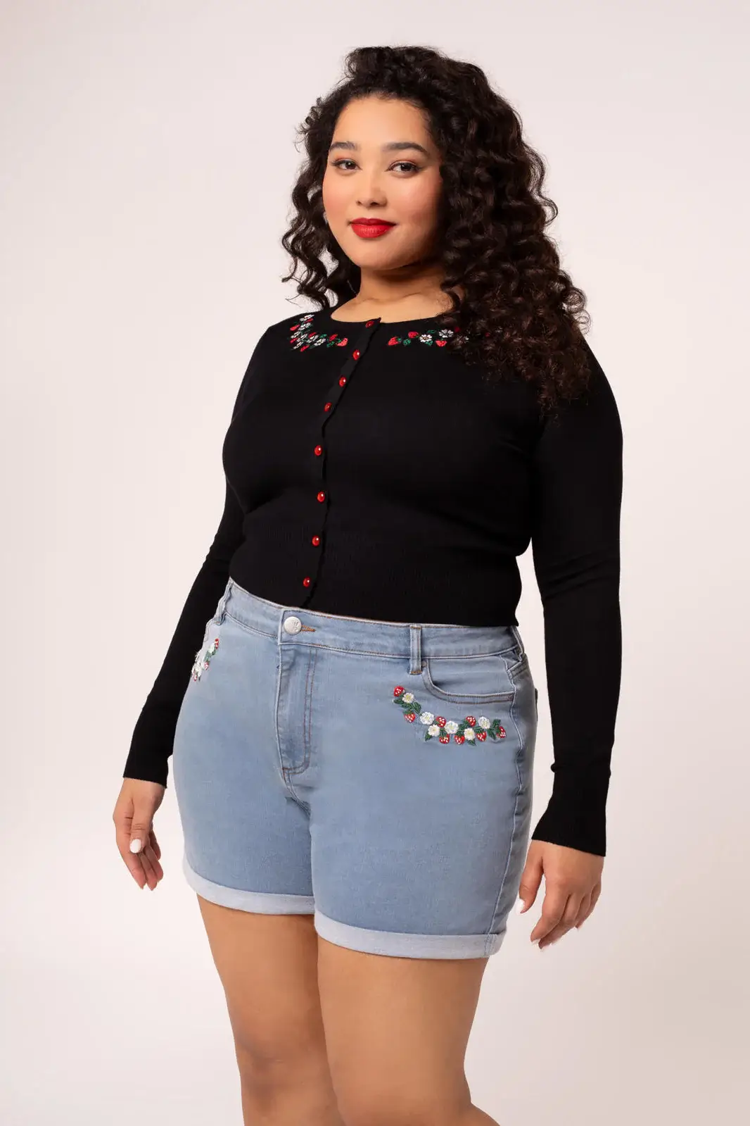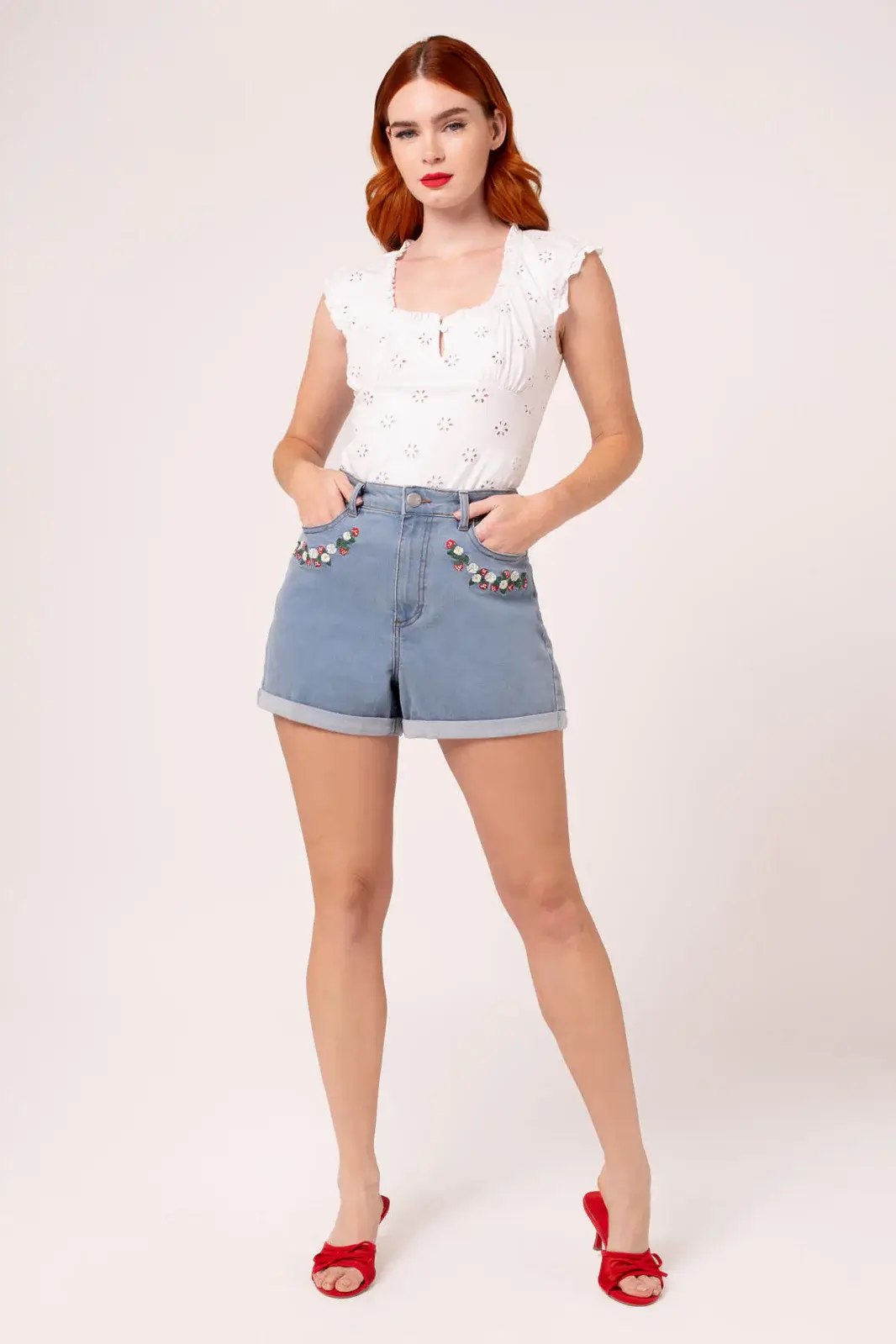 Joustavat Francoise-denimshortsit hurmaavat mansikka- ja päivänkakkarakirjailulla. Käännetyt lahkeet ja klassinen malli tekevät niistä kesän luottovaatteen.