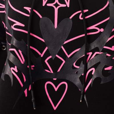 INNOCENT Thornchant -huppari yhdistää pehmeän mukavuuden ja vahvan alternative-estetiikan näyttävällä pinkillä sydänprintillä, joka erottuu dramaattisesti mustaa pohjaa vasten. Lyhyempi crop-malli tuo siluettiin modernia ryhtiä ja toimii erinomaisesti korkeavyötäröisten housujen tai hameiden parina.