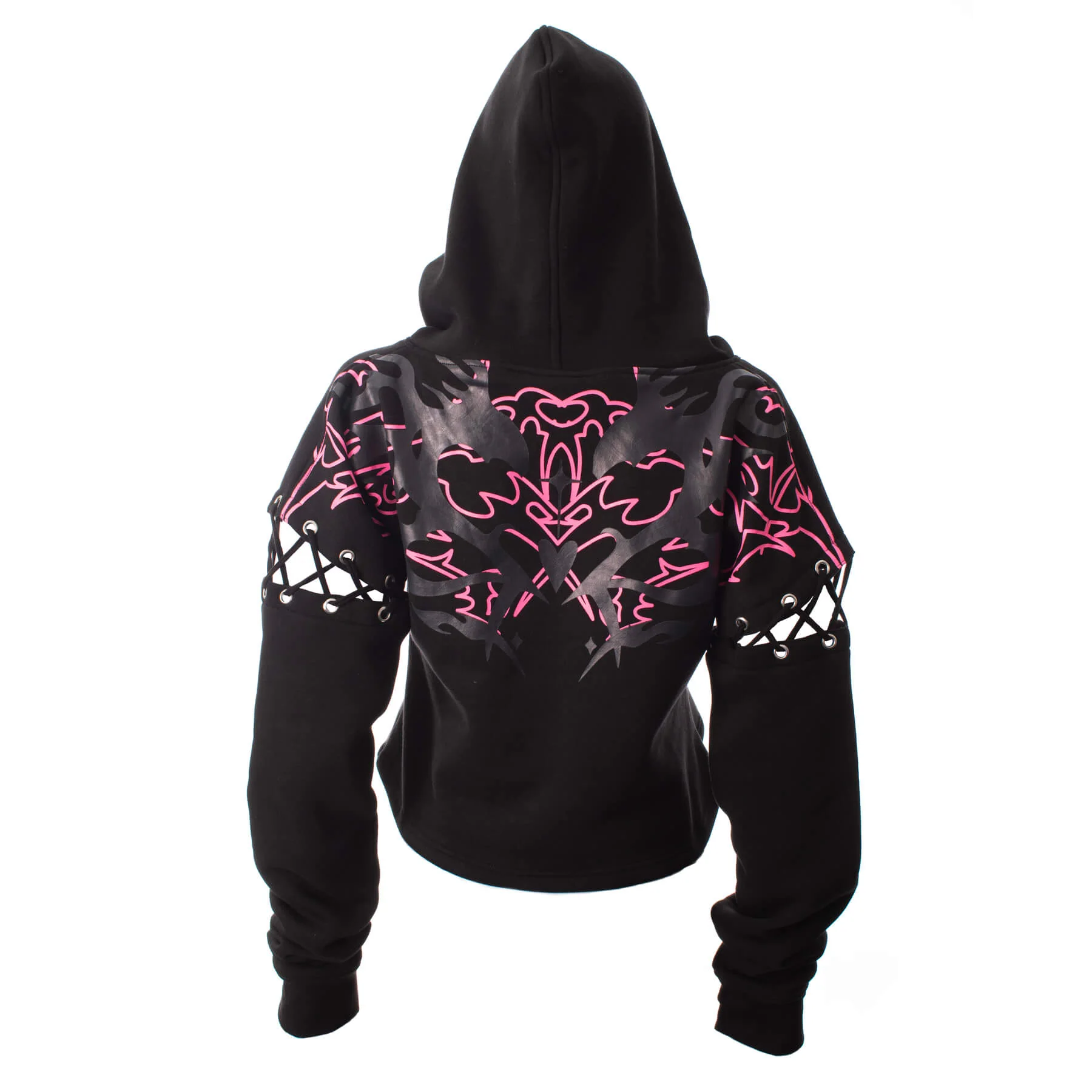 Näyttävä crop-huppari graafisella sydänprintillä ja nyörillisillä hihoilla – täydellinen valinta rohkeaan alt-tyyliin.