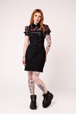 Pinafore-tyylinen leikkaus tekee mekosta täydellisen kerrostamiseen, mutta se toimii yhtä hyvin myös sellaisenaan. Suoralinjainen rintapaneeli ja suuri etutasku luovat selkeän, modernin ilmeen, jota korostavat hopeansävyinen vetoketju ja D-rengasyksityiskohdat.