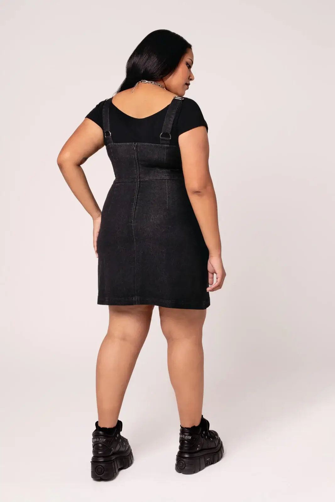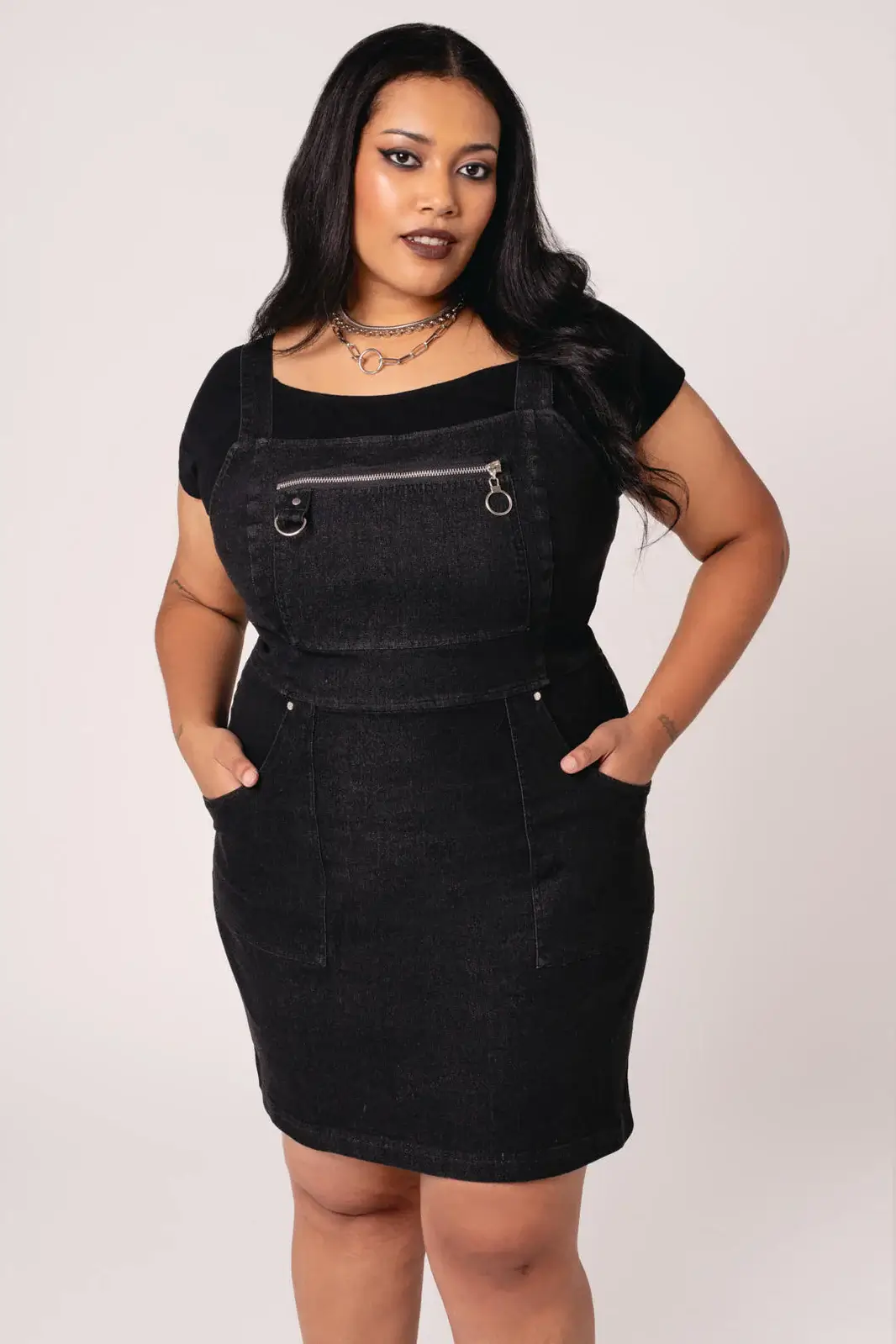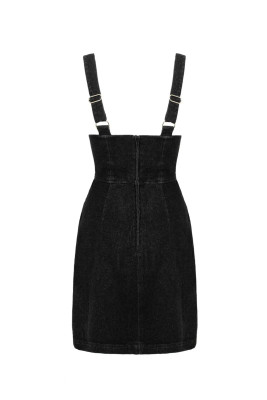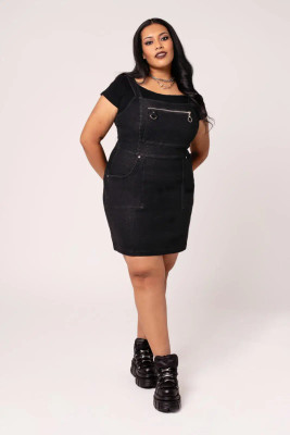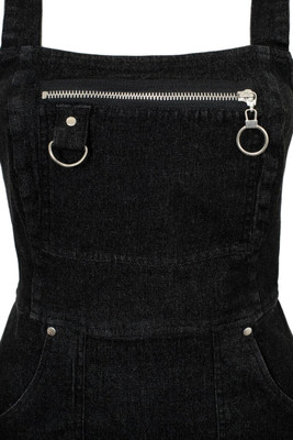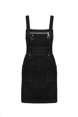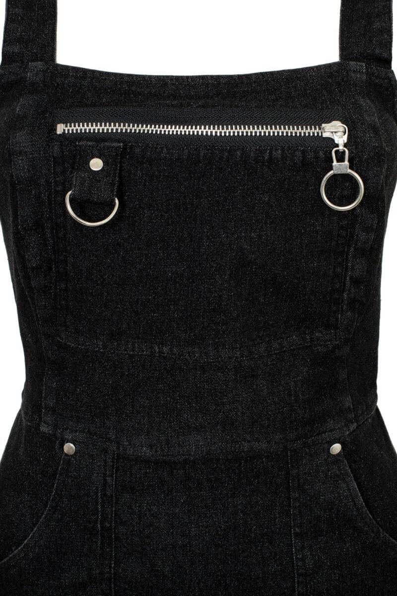 Tummasävyinen pinafore-mekko farkkutuntumalla. Näyttävät vetoketju- ja D-rengasdetaljit sekä A-linjainen malli tekevät tästä helpon luottomekon.