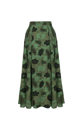 Vihreä midi-hame lohikäärme- ja kasviaiheisella kuosilla. Kauniisti laskeutuva viskoosi, taskut sivuilla ja vyötäröltä lähtevät laskokset tuovat ryhtiä.