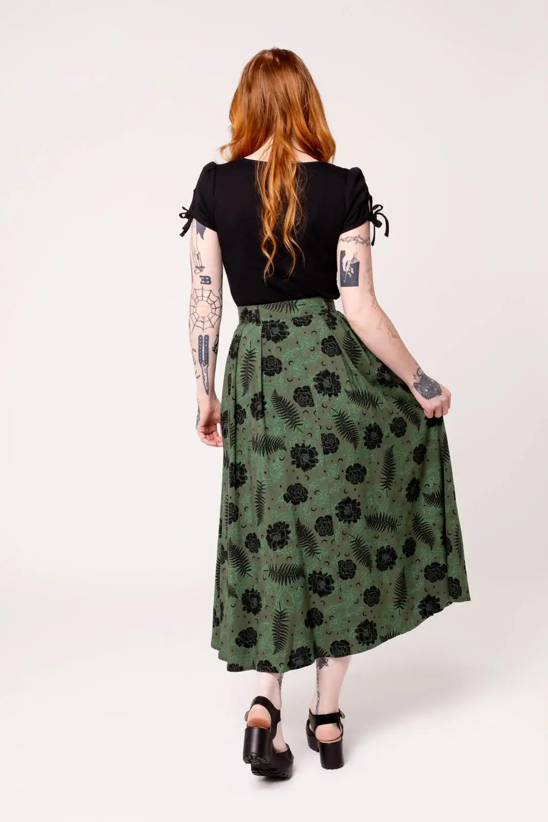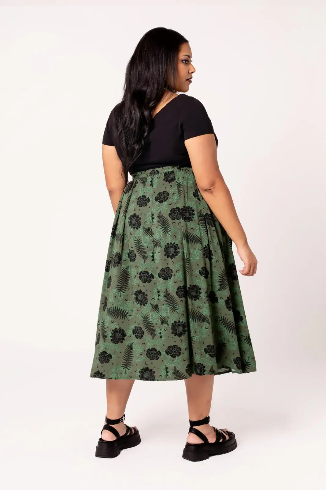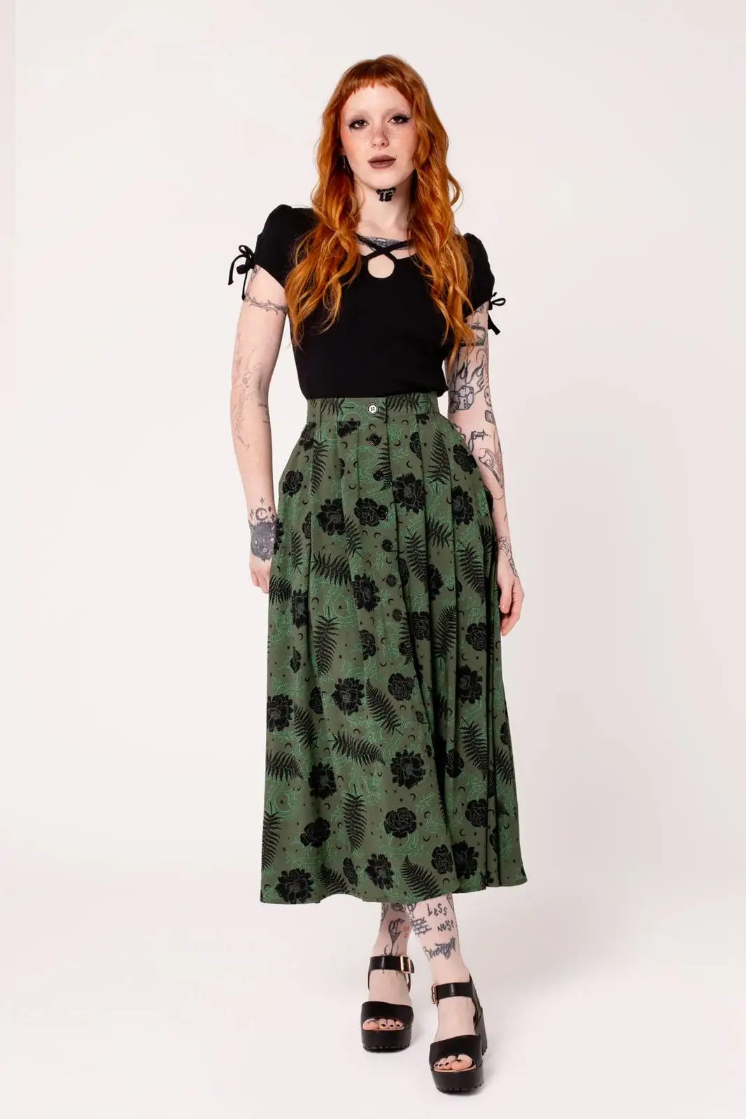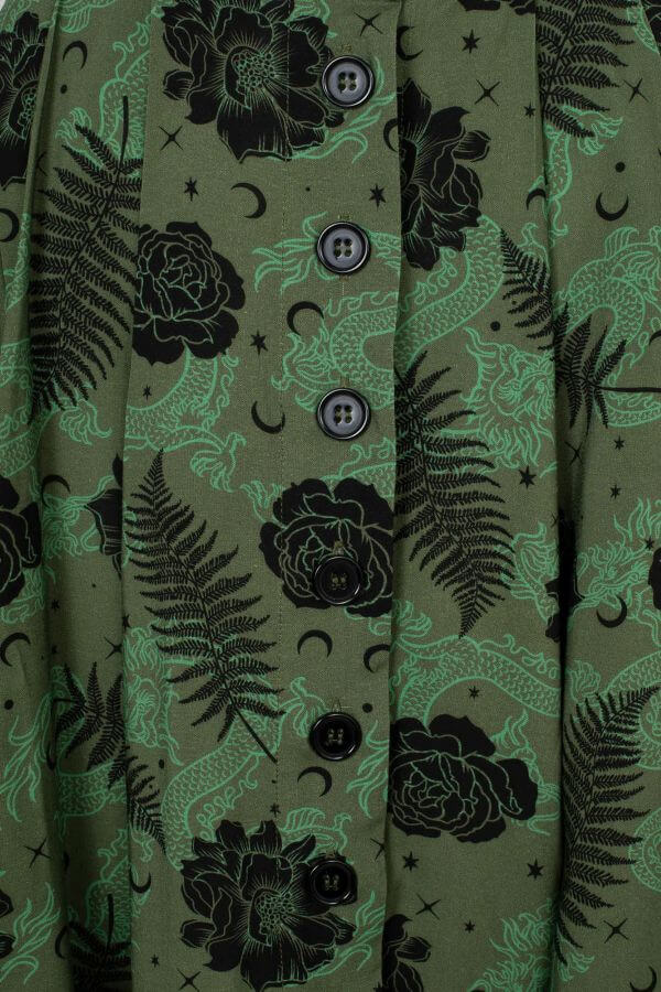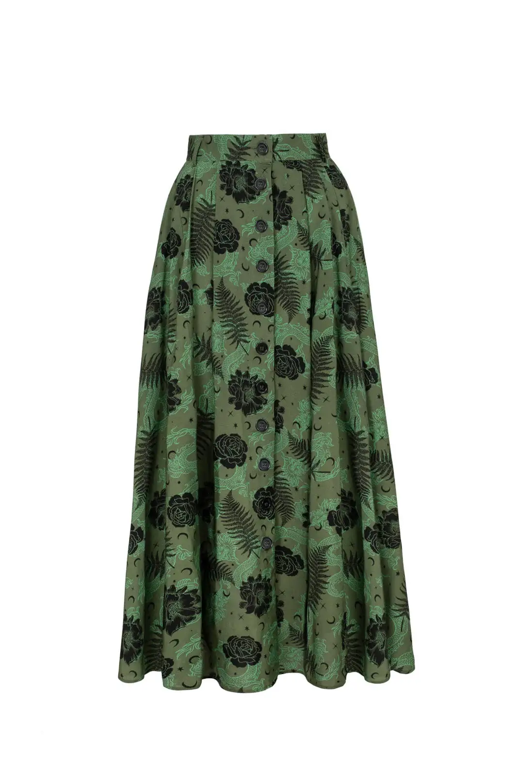 Georgia-hame tuo pukeutumiseen ripauksen fantasiaa ja mystiikkaa. Luonnonvihreälle pohjalle kuvioidut lohikäärmeet, tumma kasvillisuus ja hienovaraiset taivaalliset elementit tekevät tästä midi-hameesta katseenvangitsijan, joka erottuu edukseen ilman liiallista näyttävyyttä.