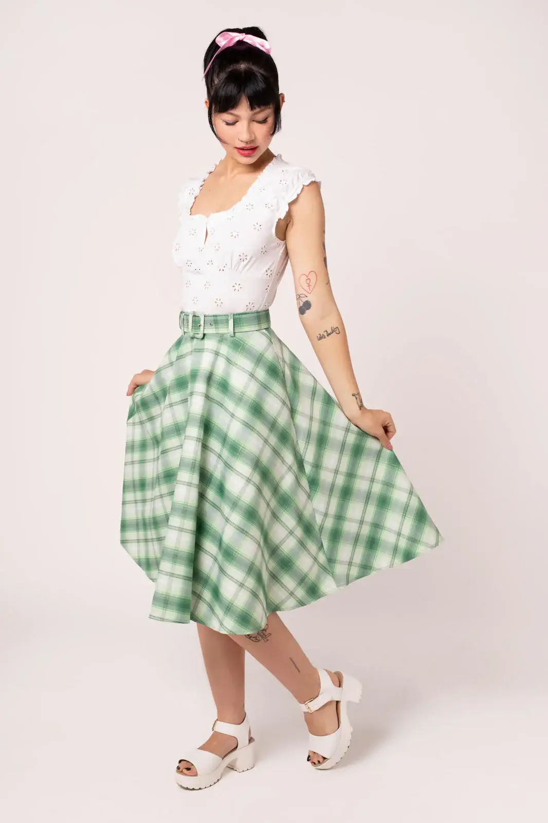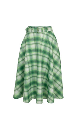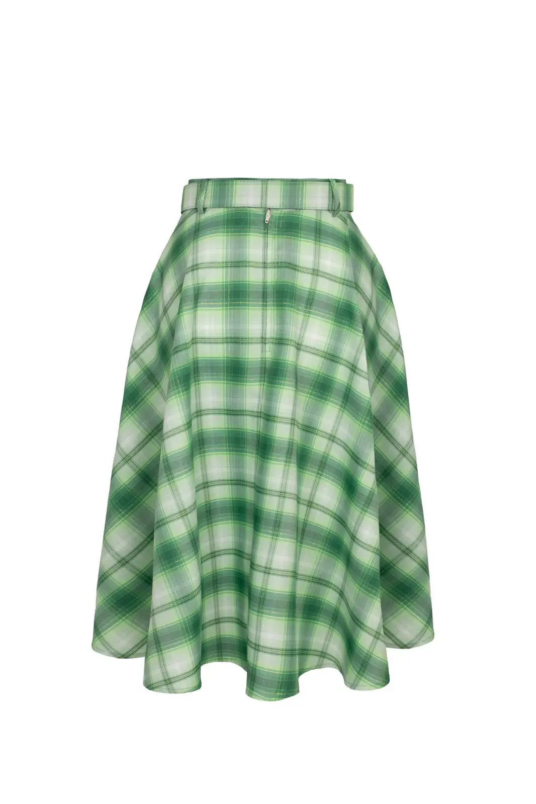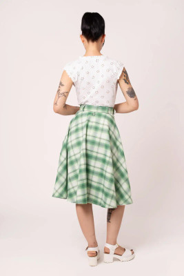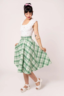 Vihreä-valkoinen 50’s-ruutuhame hienovaraisella kimalluksella. Kellomalli, taskut ja irrotettava vyö.