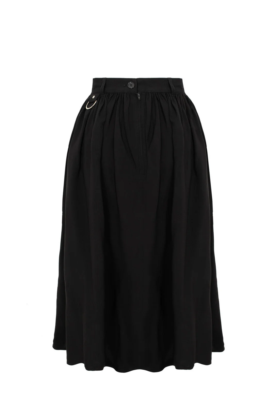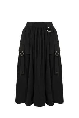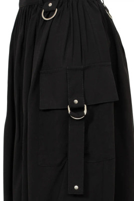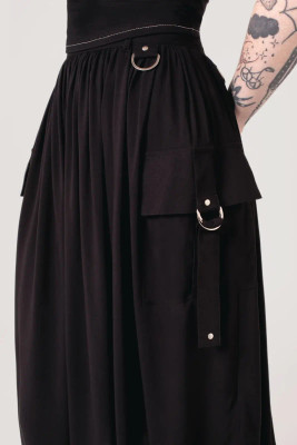 Musta midi-hame, jossa suuret taskut, niittiyksityiskohdat ja D-renkaat. Kevyesti laskeutuva viskoosi ja näyttävä, mutta selkeä ilme.