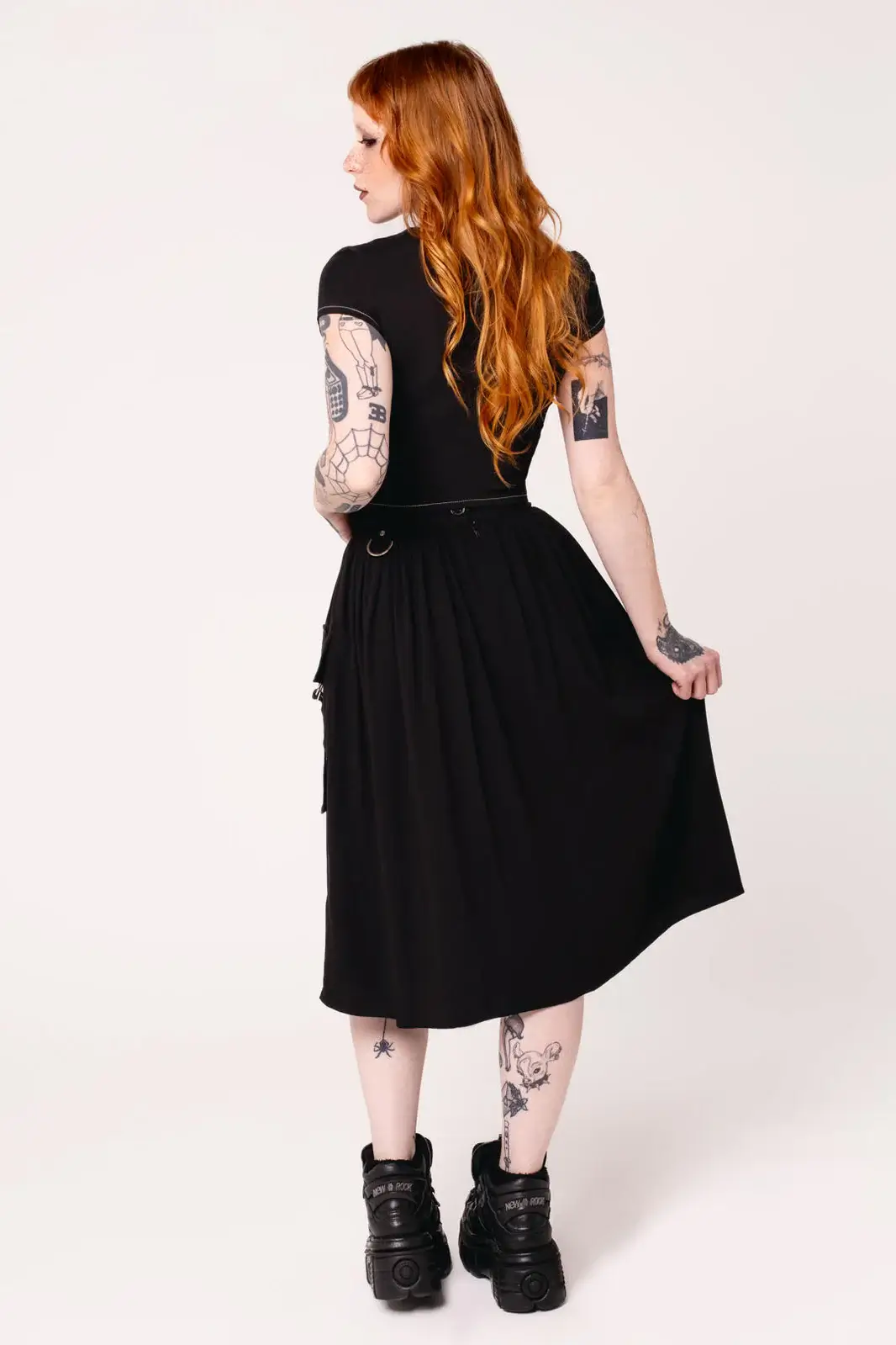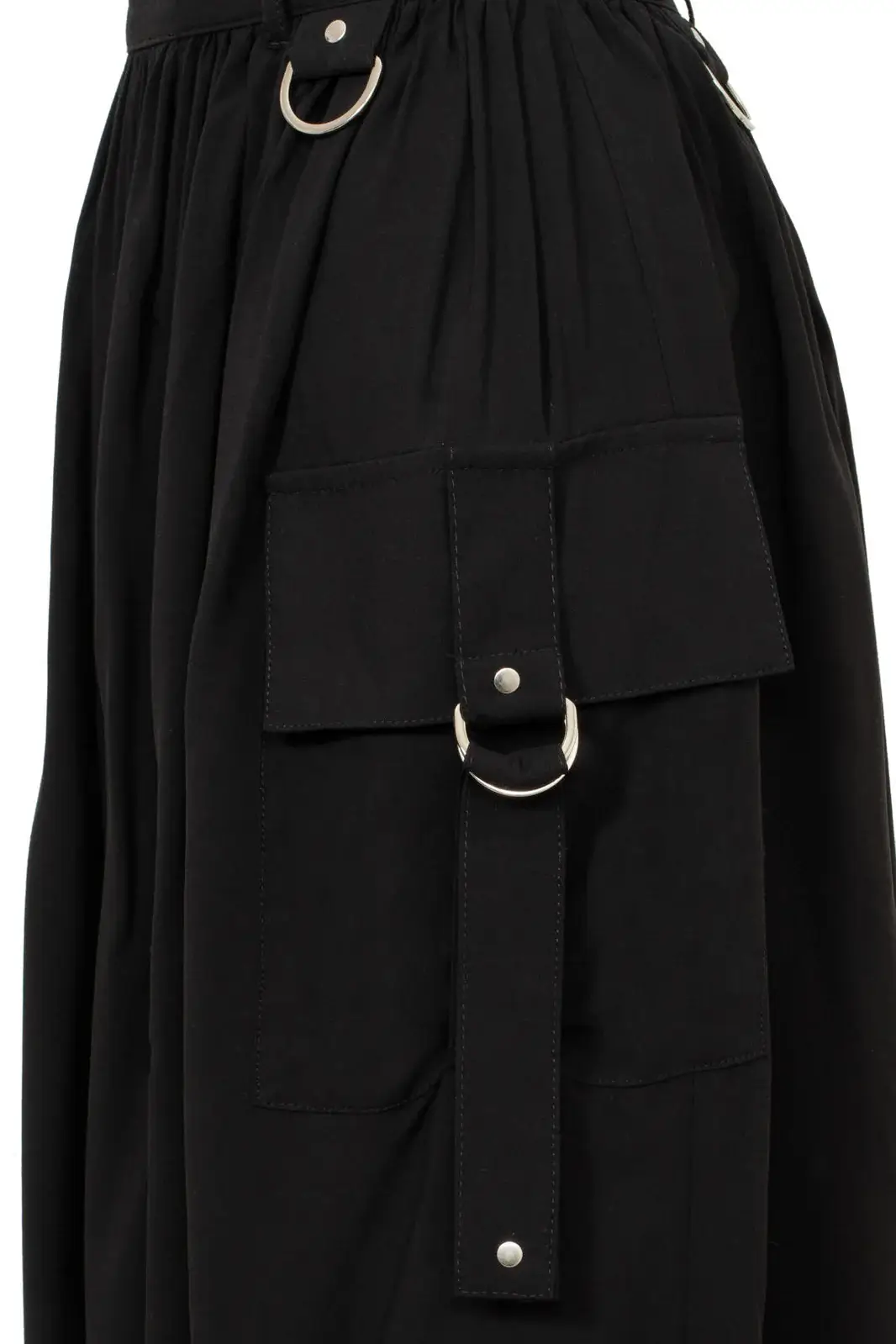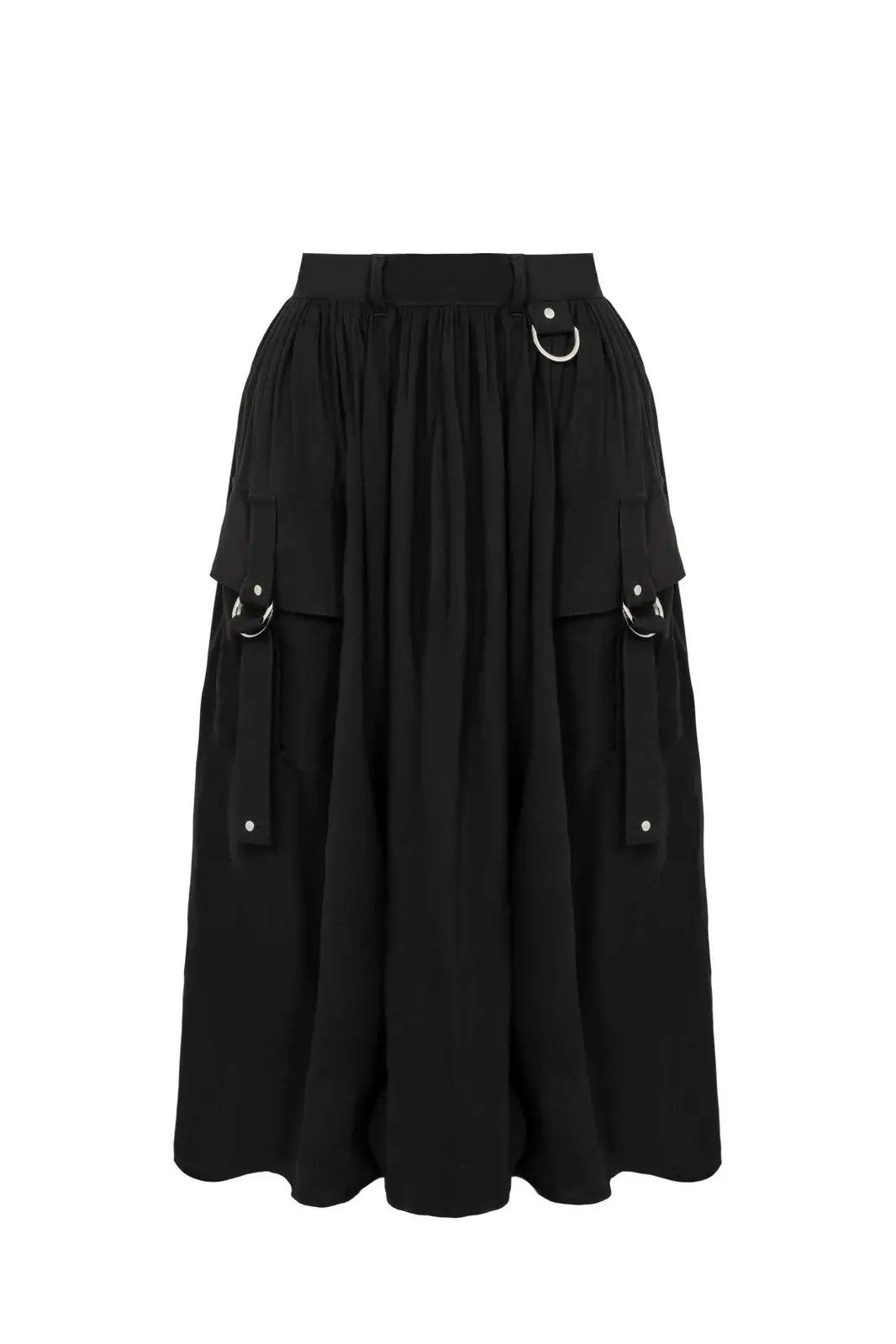 Ashleigh on musta, poimutettu midi-hame, jossa yksityiskohdat tekevät kokonaisuudesta näyttävän mutta hallitun. Etupuolen suuret taskut on viimeistelty hopeanvärisin niitein ja D-renkain, ja pitkät hihnat korostavat liikettä. Vyölenkistä roikkuu D-rengas, johon voit kiinnittää haluamasi asusteen.
