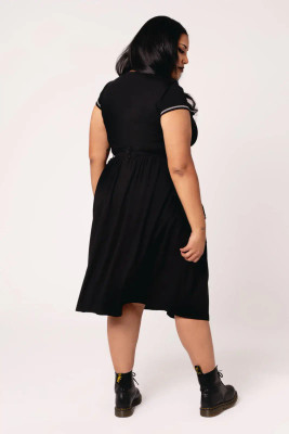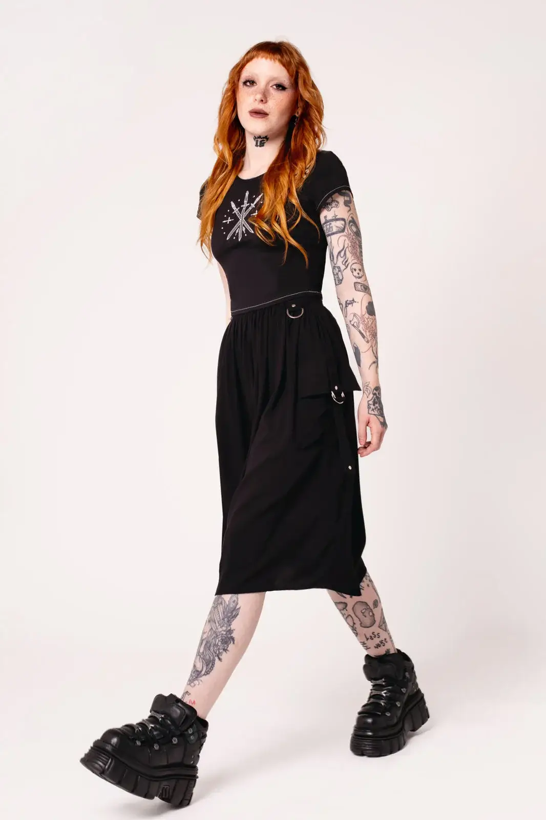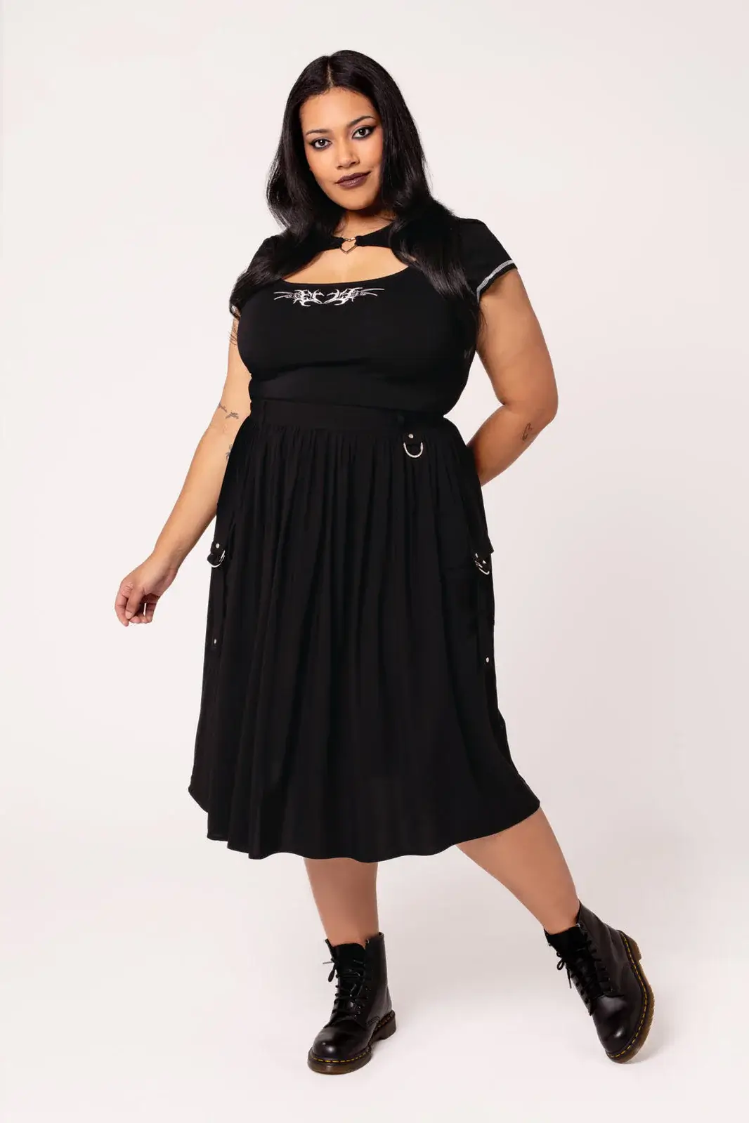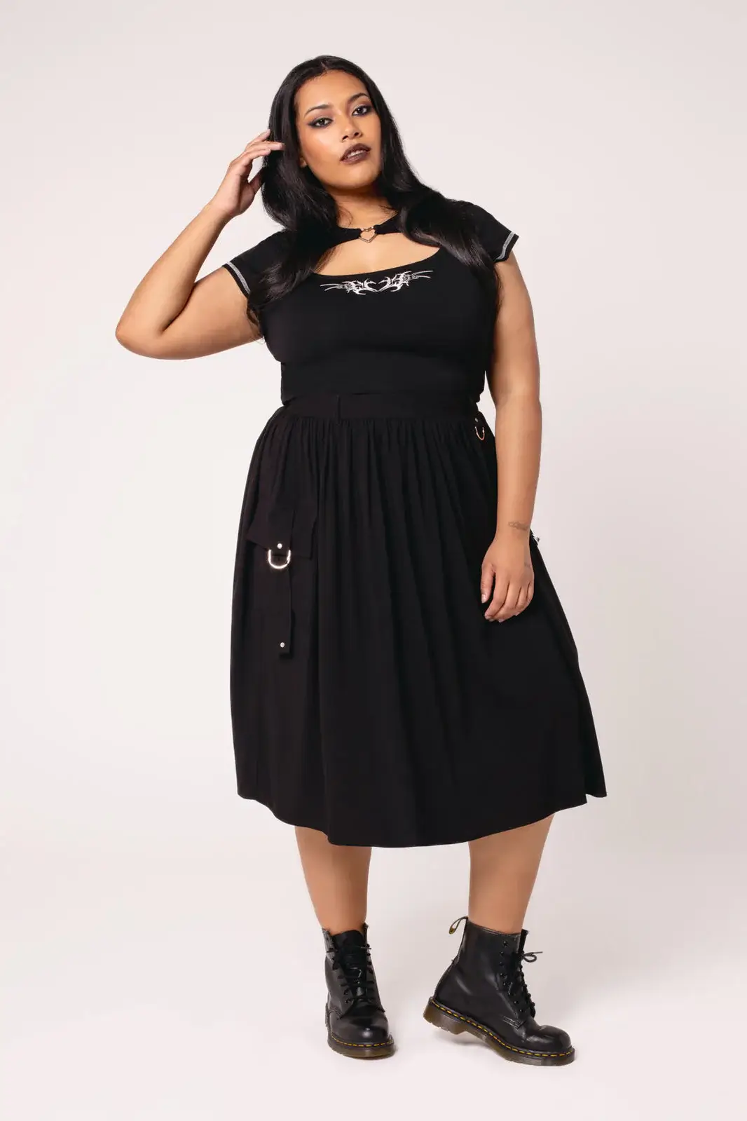 Ashleigh on musta, poimutettu midi-hame, jossa yksityiskohdat tekevät kokonaisuudesta näyttävän mutta hallitun. Etupuolen suuret taskut on viimeistelty hopeanvärisin niitein ja D-renkain, ja pitkät hihnat korostavat liikettä. Vyölenkistä roikkuu D-rengas, johon voit kiinnittää haluamasi asusteen.