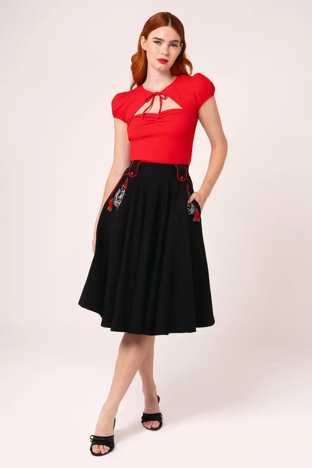 Musta 50-luvun kellohame näyttävillä kirjailuilla. Ruusut, hevosenkengät ja skorpioni tuovat western-henkistä asennetta klassiseen vintage-siluettiin.