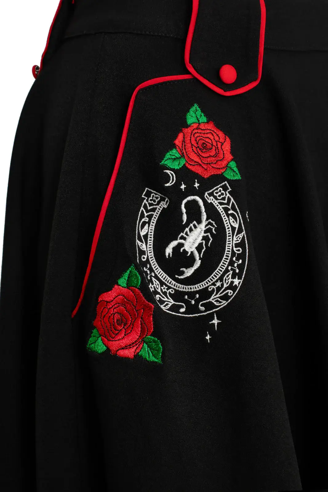 Mustan bengaline-kankaan etutaskuja koristavat näyttävät kirjailut: ruusut, hevosenkengät ja skorpioni muodostavat yksityiskohtaisen, hieman tatuointitaiteesta inspiroituneen kuvion. Punainen kanttaus taskuissa ja vyötärön lenkeissä korostaa yksityiskohtia ja tuo kokonaisuuteen kontrastia.