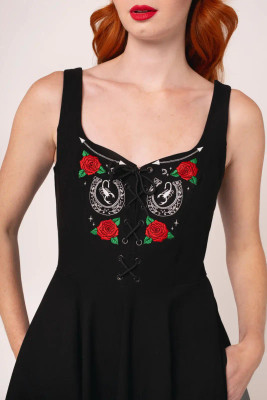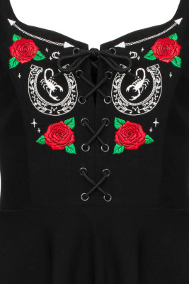 Musta 50-luvun kellomekko näyttävillä kirjailuilla. Hevosenkengät, ruusut ja skorpioni tuovat western-henkistä asennetta klassiseen vintage-siluettiin.