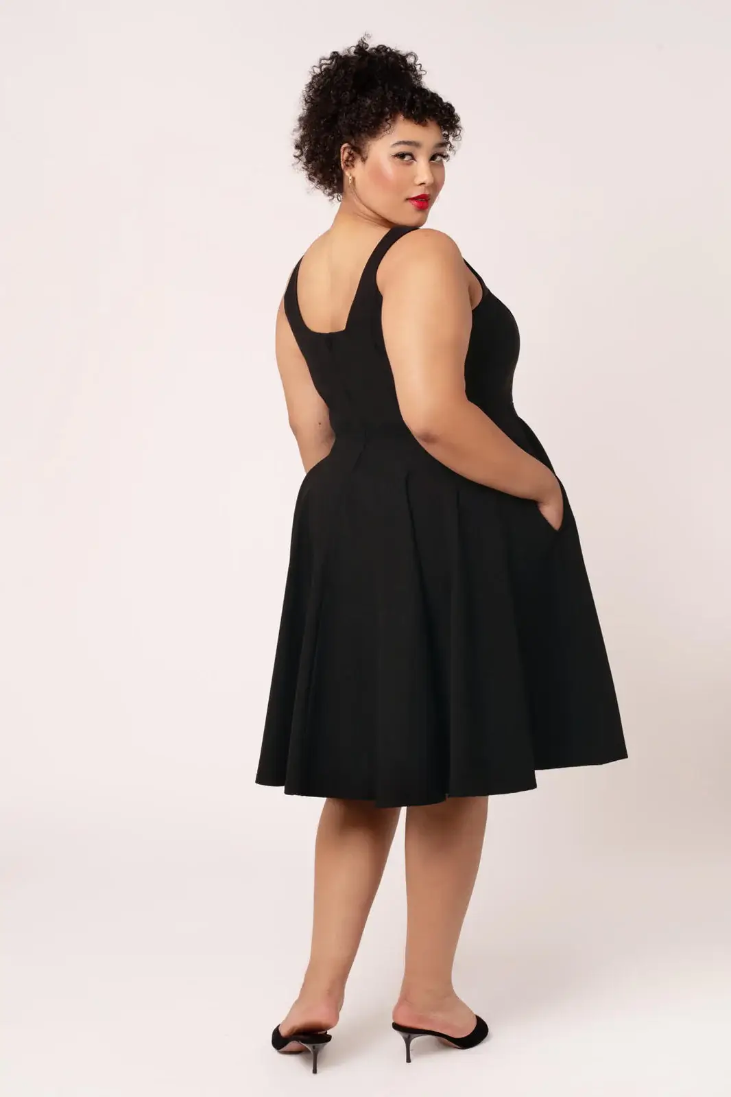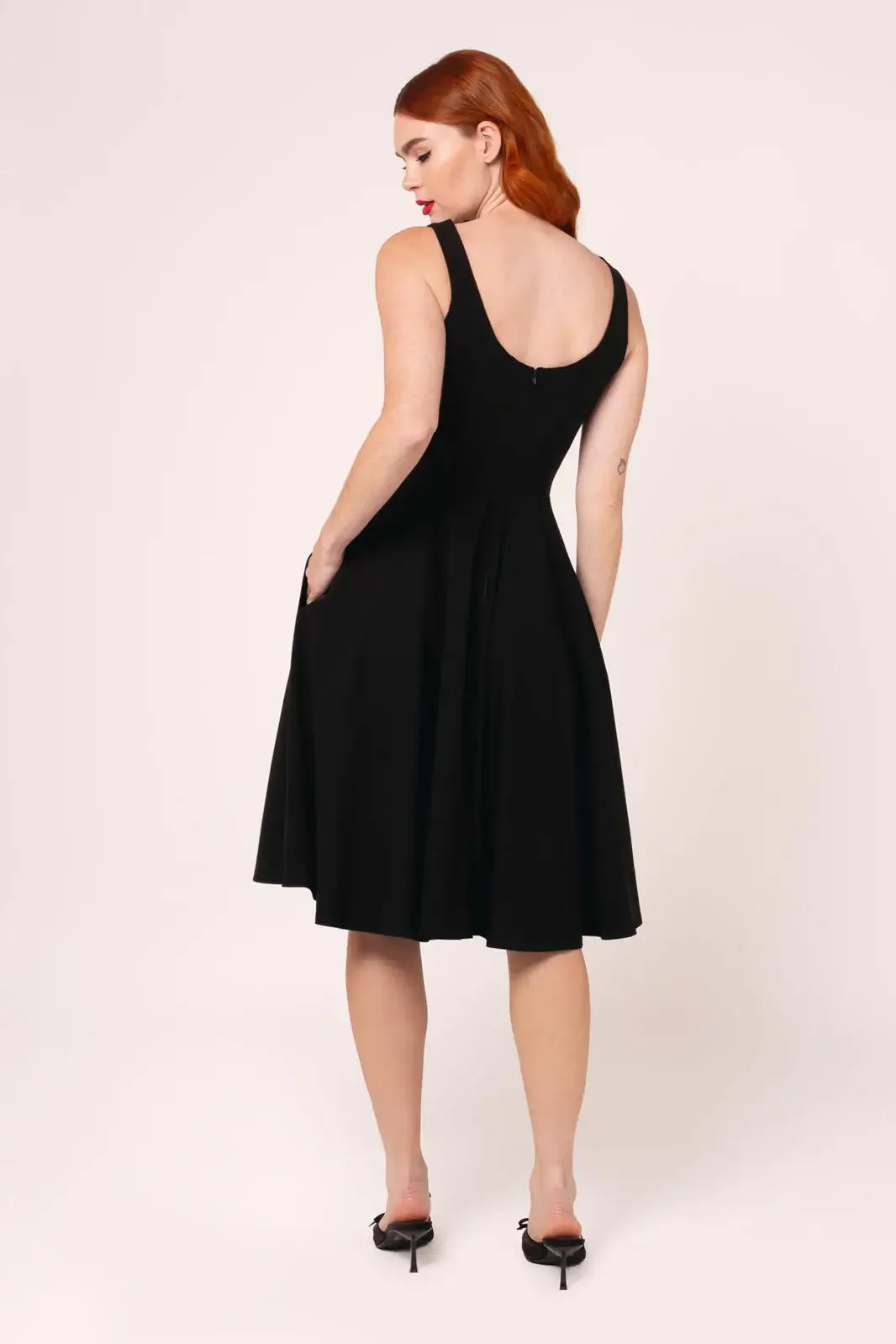 Vyötäröltä alkava kellomainen hameosa luo kauniin vintage-siluetin ja liikkuu näyttävästi askelten mukana. Sivusaumataskut tuovat mekkoon käytännöllisyyttä ilman että linja rikkoutuu.