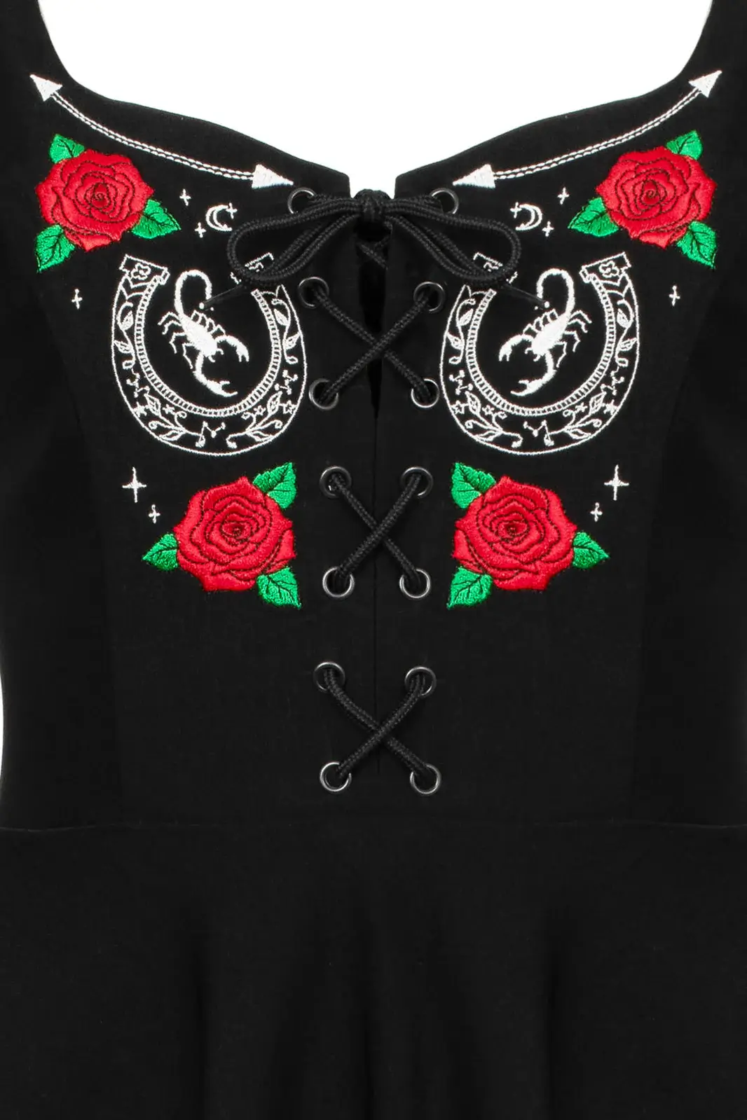 Mekon yläosaa koristavat yksityiskohtaiset kirjailut, joissa yhdistyvät hevosenkengät, skorpioni ja ruusut. Koristelu tuo mekkoon hieman tatuointitaiteesta inspiroitunutta estetiikkaa ja tekee siitä näyttävän katseenvangitsijan.
